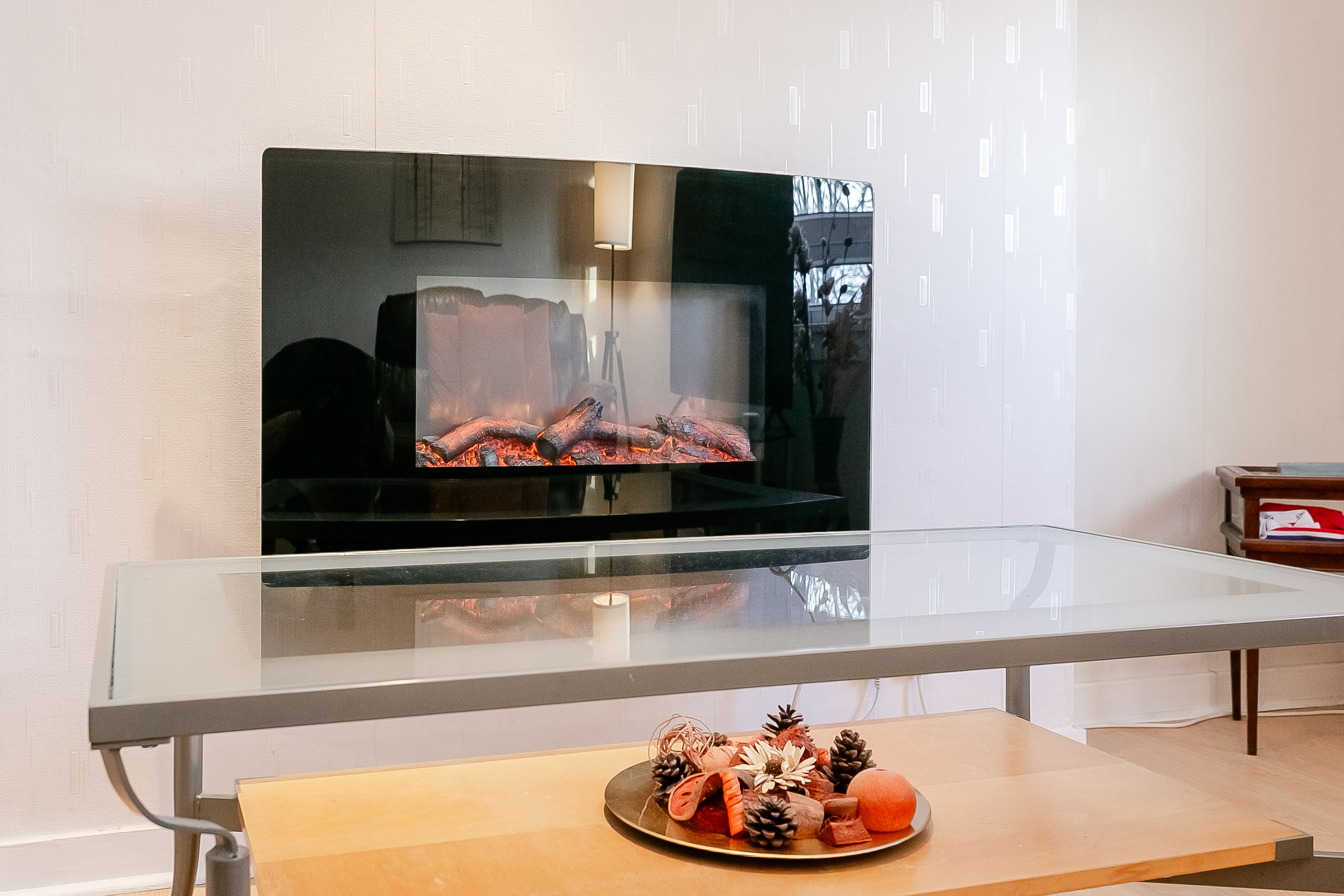 It features attractive wood-effect flooring, contemporary spotlighting, and a charming fireplace that acts as a focal point. A wide window draws in plentiful natural light, while a built-in storage cupboard adds useful practicality.