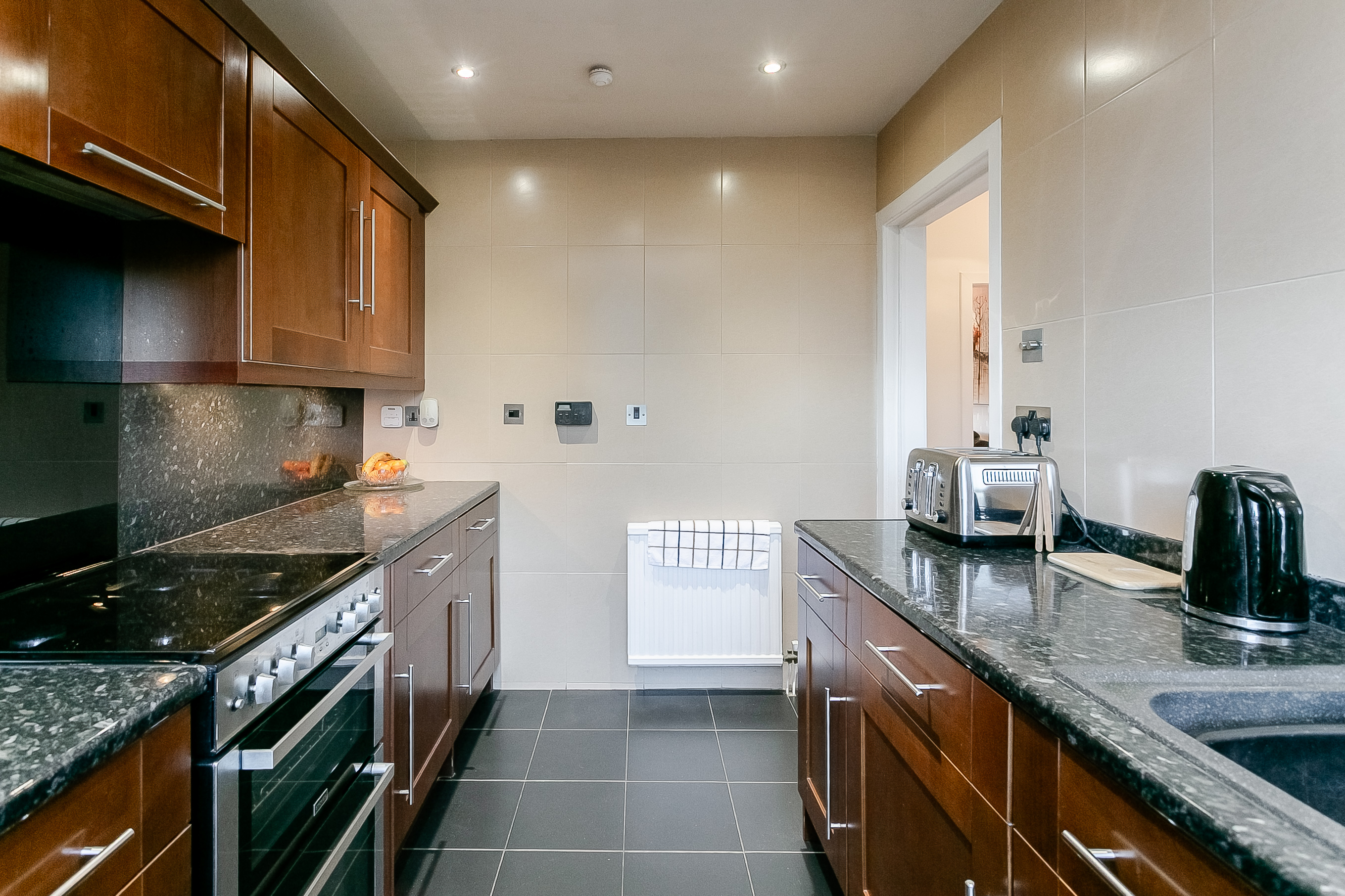 Appliances provided consist of a fridge, freezer, washing machine and gas cooker. Bedroom one is spacious and enjoys wood-effect flooring along with central light fittings.