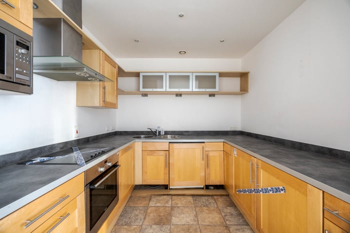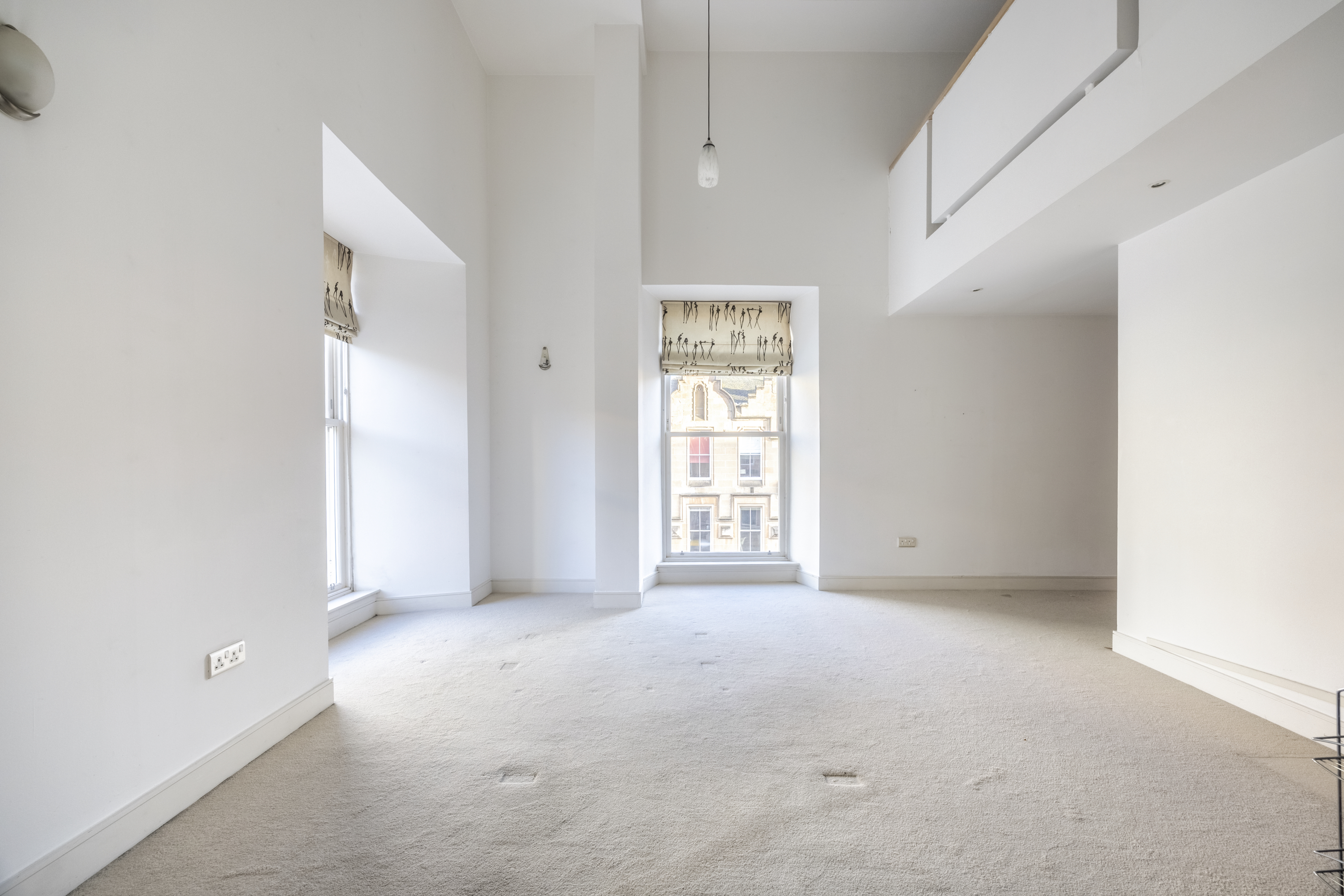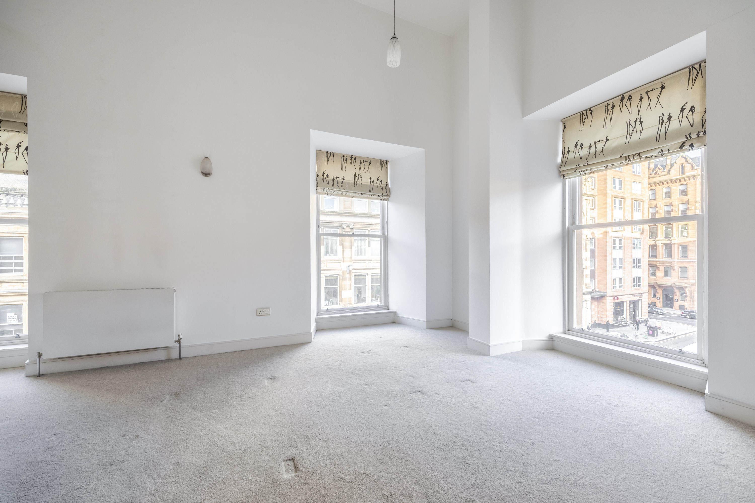 Tastefully presented, spacious, and flexible two-bedroom second-floor flat with a stylish mezzanine level. Conveniently positioned within the sought-after Merchant City Conservation Area. An inviting entrance opens into a generous space with carpeted flooring that flows throughout, leading into a bright and spacious living/dining area enhanced by large windows that allow plenty of natural light.