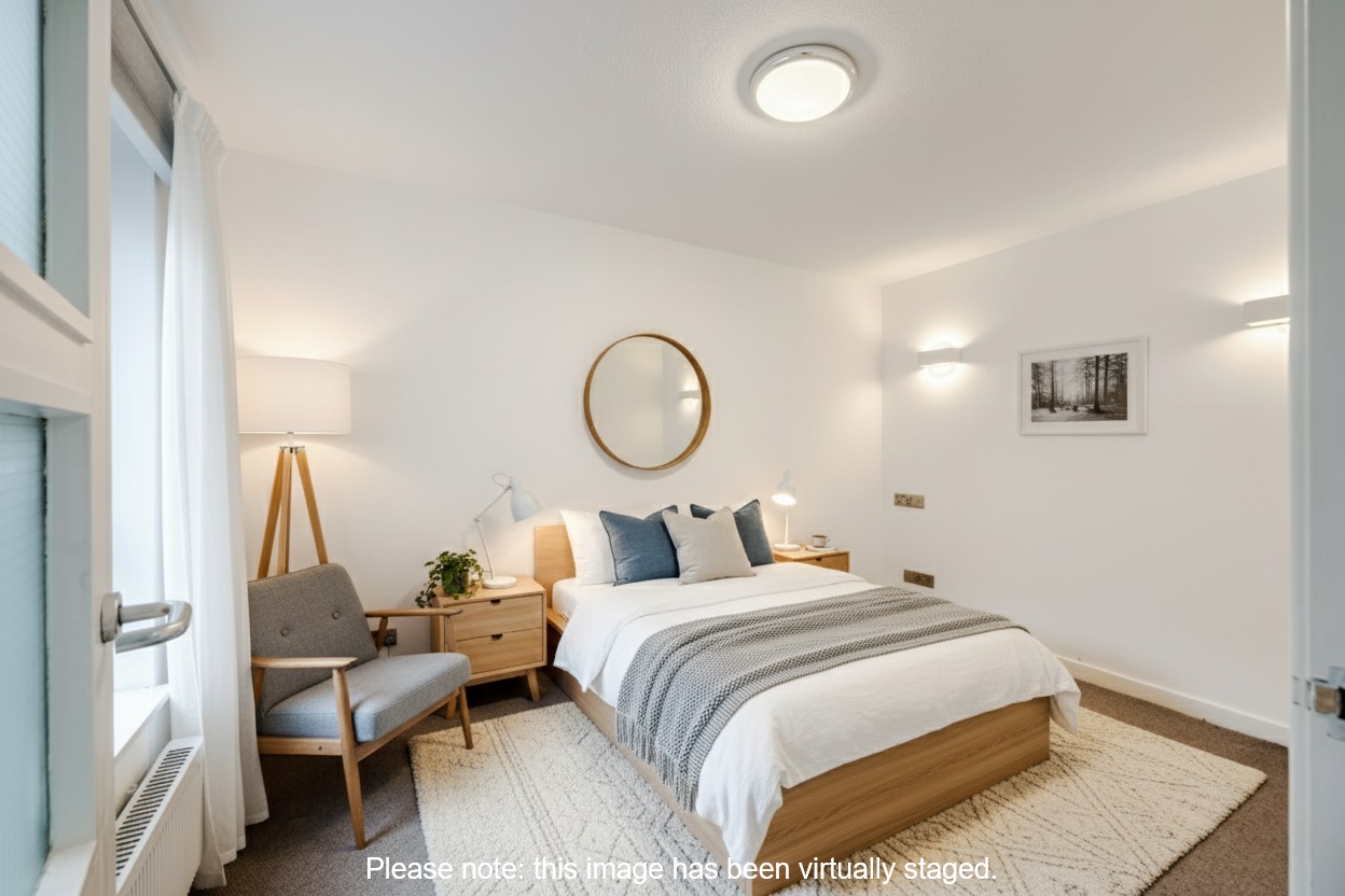 A separate built-in cupboard adds excellent additional storage. The spacious double bedroom features light, neutral décor, carpeted flooring, fitted lighting, and twin windows that allow plenty of natural light.