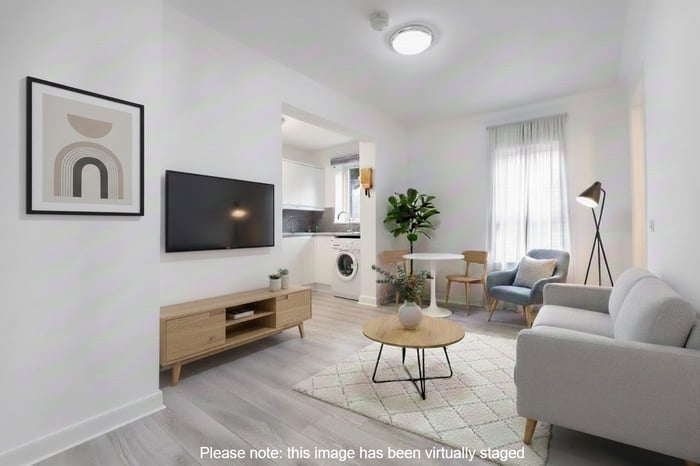 Modern wood-effect flooring flows seamlessly through to the kitchen and bathroom, while the living room also offers ample space for dining. Set just off the main living area, the stylish and well-proportioned kitchen is fitted with contemporary units, stone-effect worktops with matching splashbacks, a sink with drainer, and an integrated oven, electric hob and fridge.