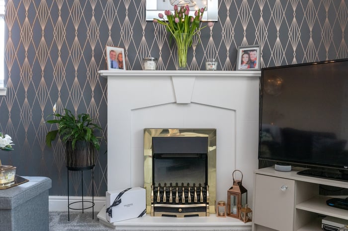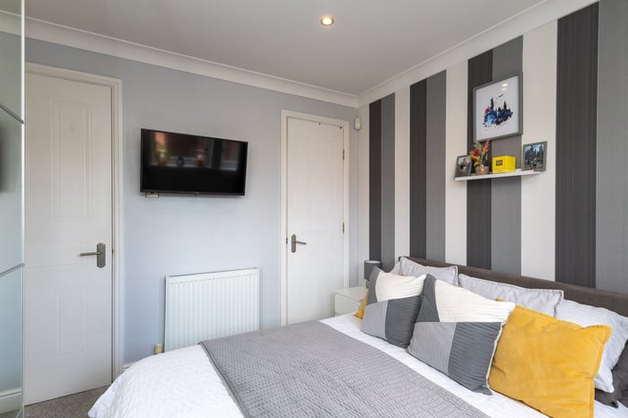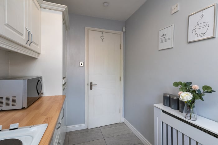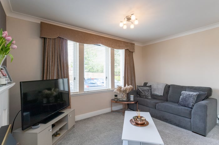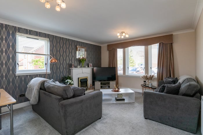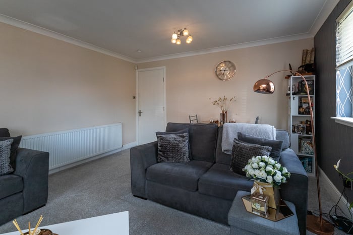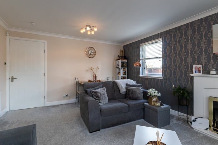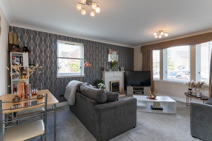 The carpeted entrance hall gives access throughout and includes a built-in store cupboard, recessed spotlighting and the secured entry handset. A good-sized, dual-aspect public room can accommodate lounge and dining furniture and includes a feature fireplace, plan coving and carpeted flooring.