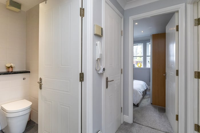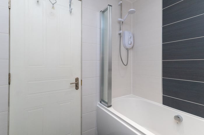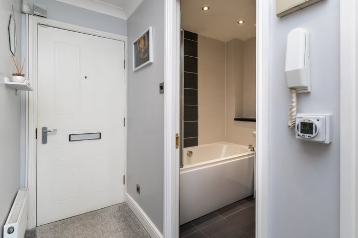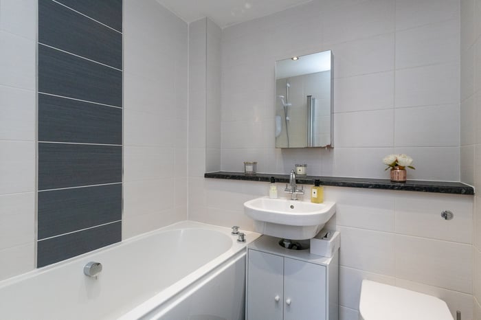 Set internally off the hall, the fully-tiled bathroom is fitted with a modern suite, including a shower unit over the bath, a ladder-style radiator, and recessed spotlighting.