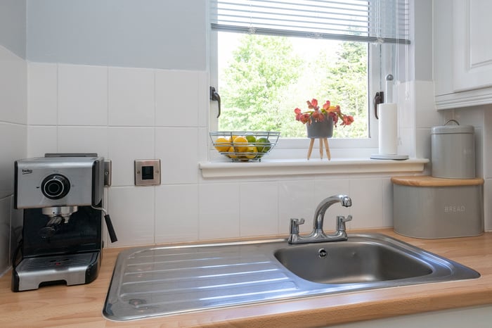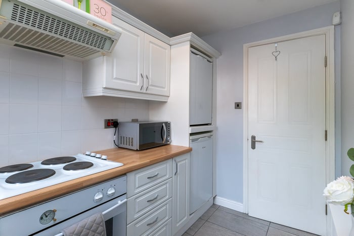 The bright fitted kitchen has ample fitted storage, wood-effect worktops, sink with drainer, a tiled surround, and an integrated oven and electric hob with a filter fan above. A double bedroom includes a built-in store, carpeted flooring and space for additional free standing storage.