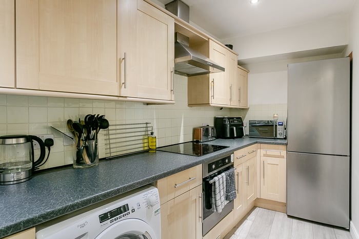 Flowing seamlessly into the kitchen, the continued wood-effect flooring complements a well-appointed fitted kitchen featuring granite-effect countertops, a tiled splashback, and integrated appliances including an oven with electric hob and canopy above, dishwasher, washing machine, and a sink with drainer, along with space for a fridge/freezer. To the rear, both double bedrooms—bedrooms one and two—are finished with matching wood-effect flooring and light decor, with bedroom one also benefiting from a built-in cupboard.
