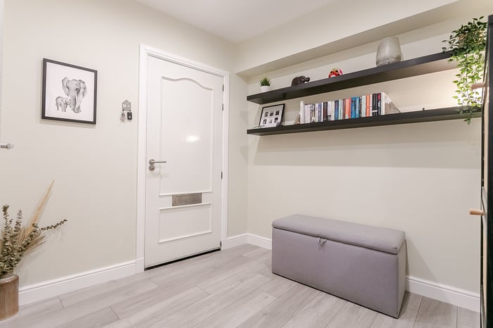 A stunning and welcoming entrance provides access to all rooms. The spacious living room boasts a modern contemporary design, beautifully finished with wood-effect flooring and light decor throughout—an ideal space for both relaxing and entertaining.