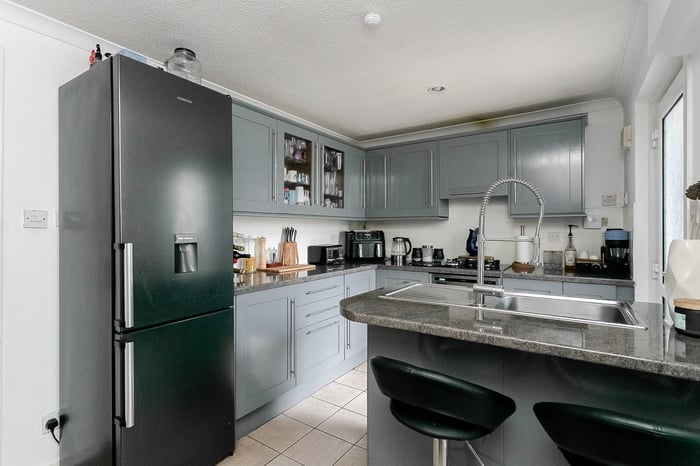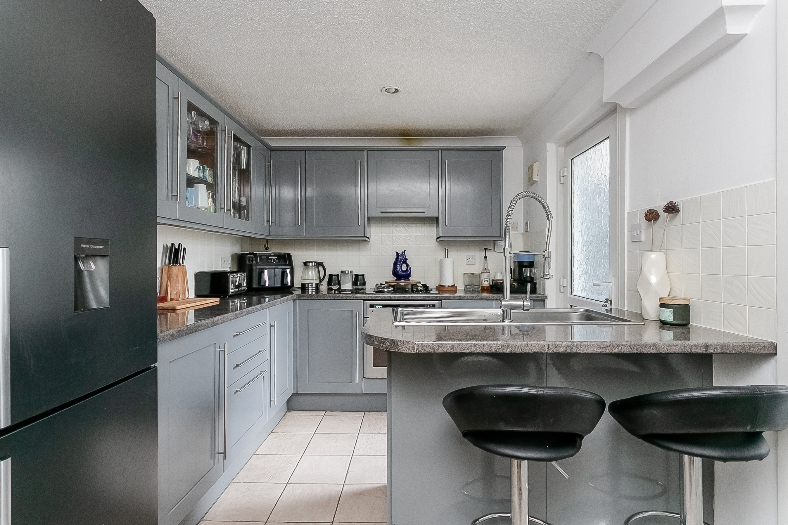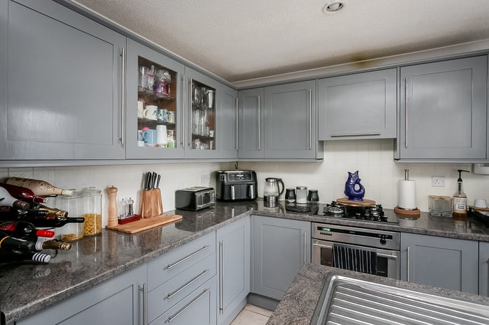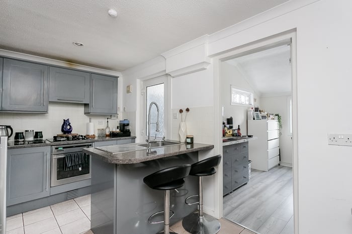 The kitchen is set just off the living room. It features a modern finish with granite-effect countertops, a tiled-effect splashback, a stainless steel sink with drainer, and an integrated oven with gas hob and canopy above, as well as a breakfast bar ideal for entertaining.