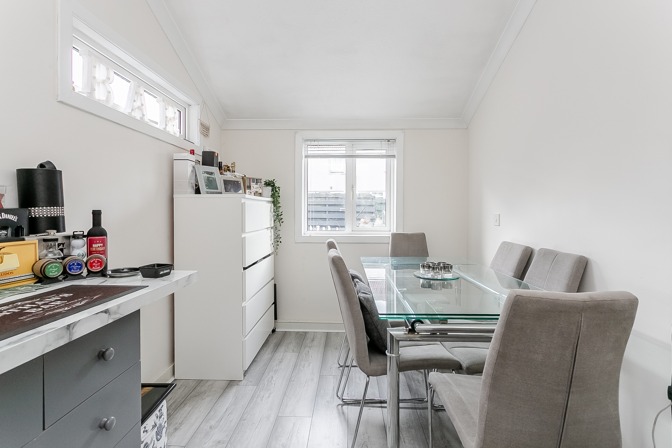 This area also provides direct access to the patio and garden, making it a perfect space for social gatherings. The dining room is situated off the kitchen and features a light décor and wood-effect flooring, providing additional space for entertaining.