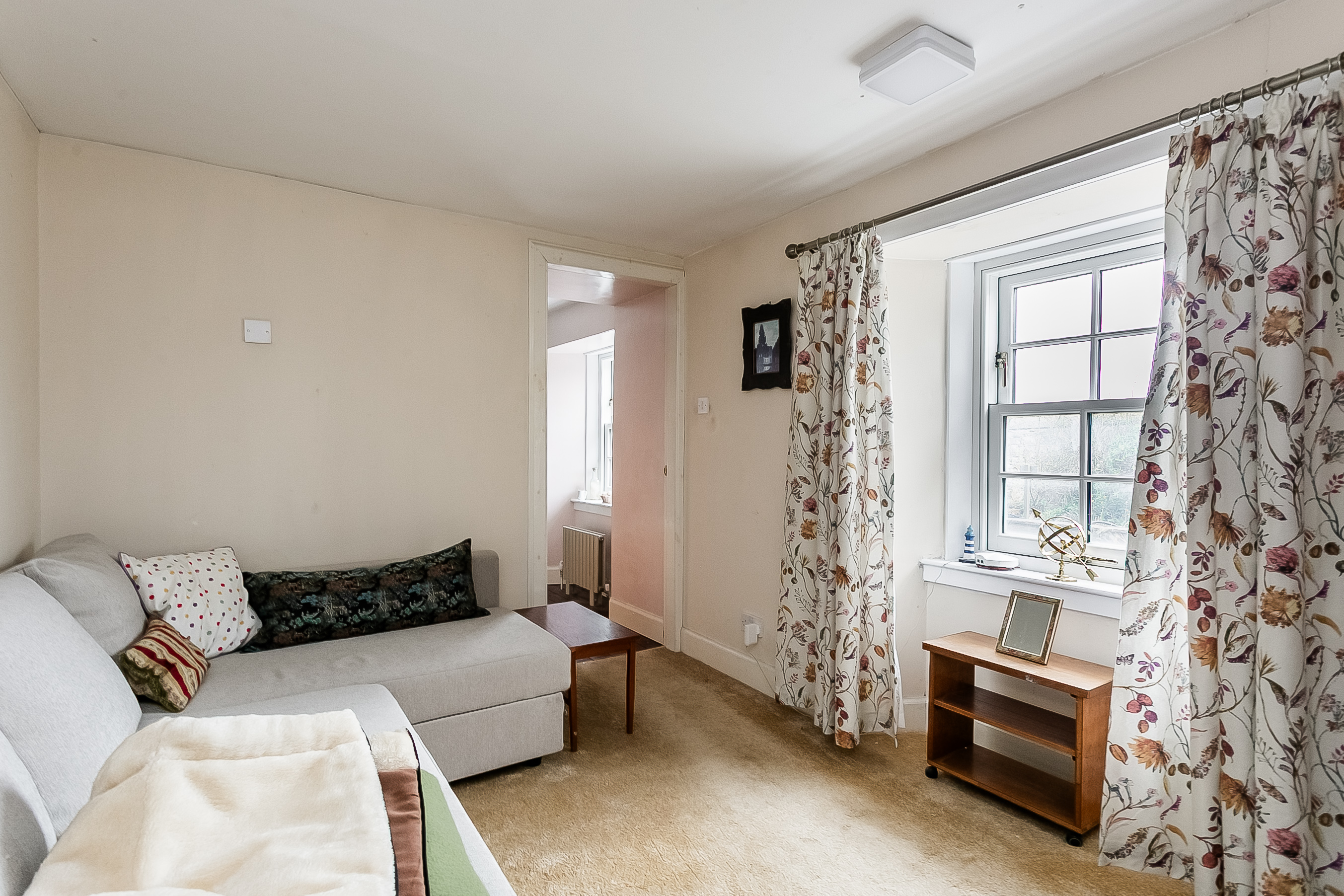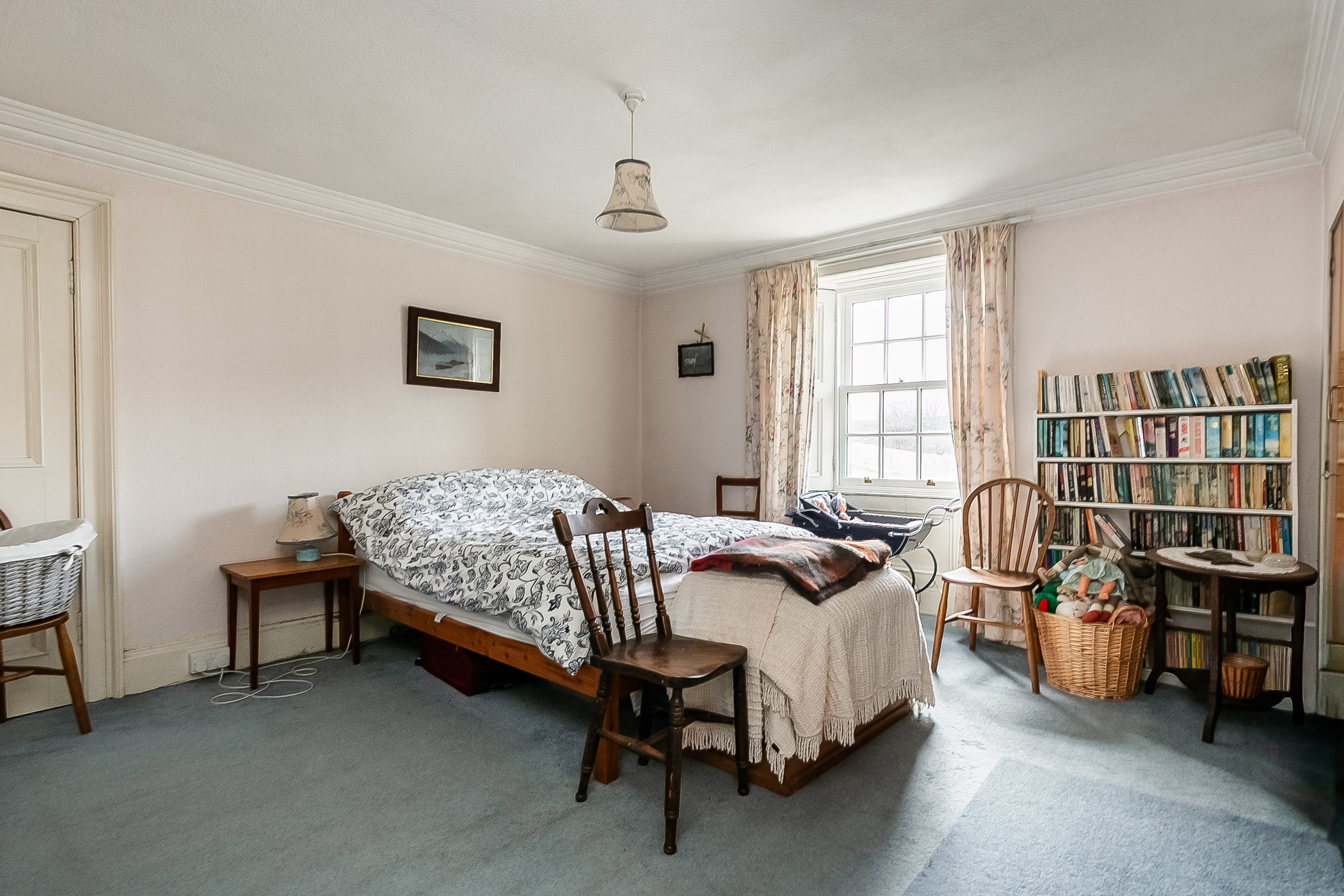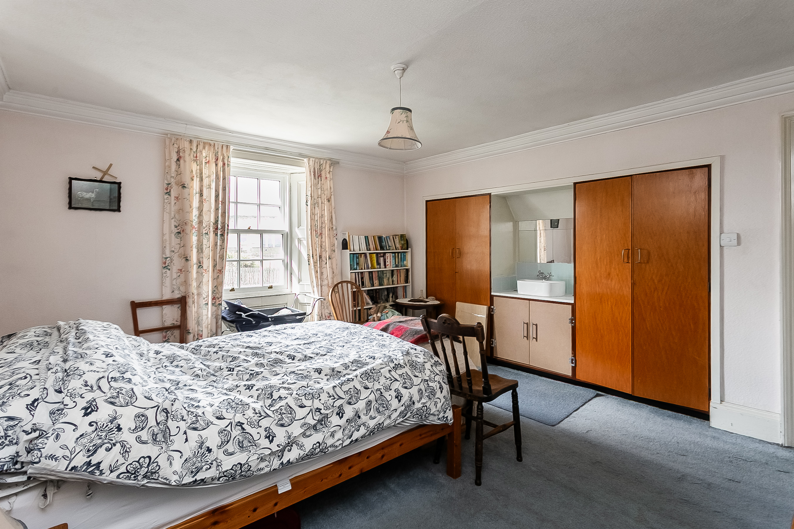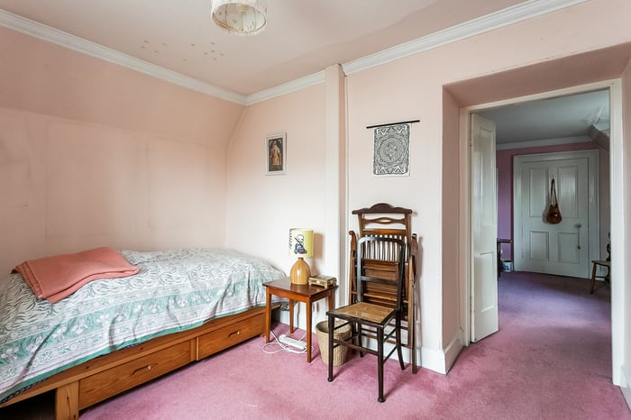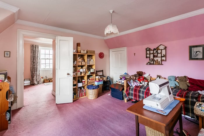 A charming staircase rises to the upper landing, where two particularly spacious double bedrooms are positioned on opposite sides of the property, both benefiting from built-in storage. A further dual-aspect room offers versatility as a playroom, study, or an additional bedroom and leads through to bedroom three.