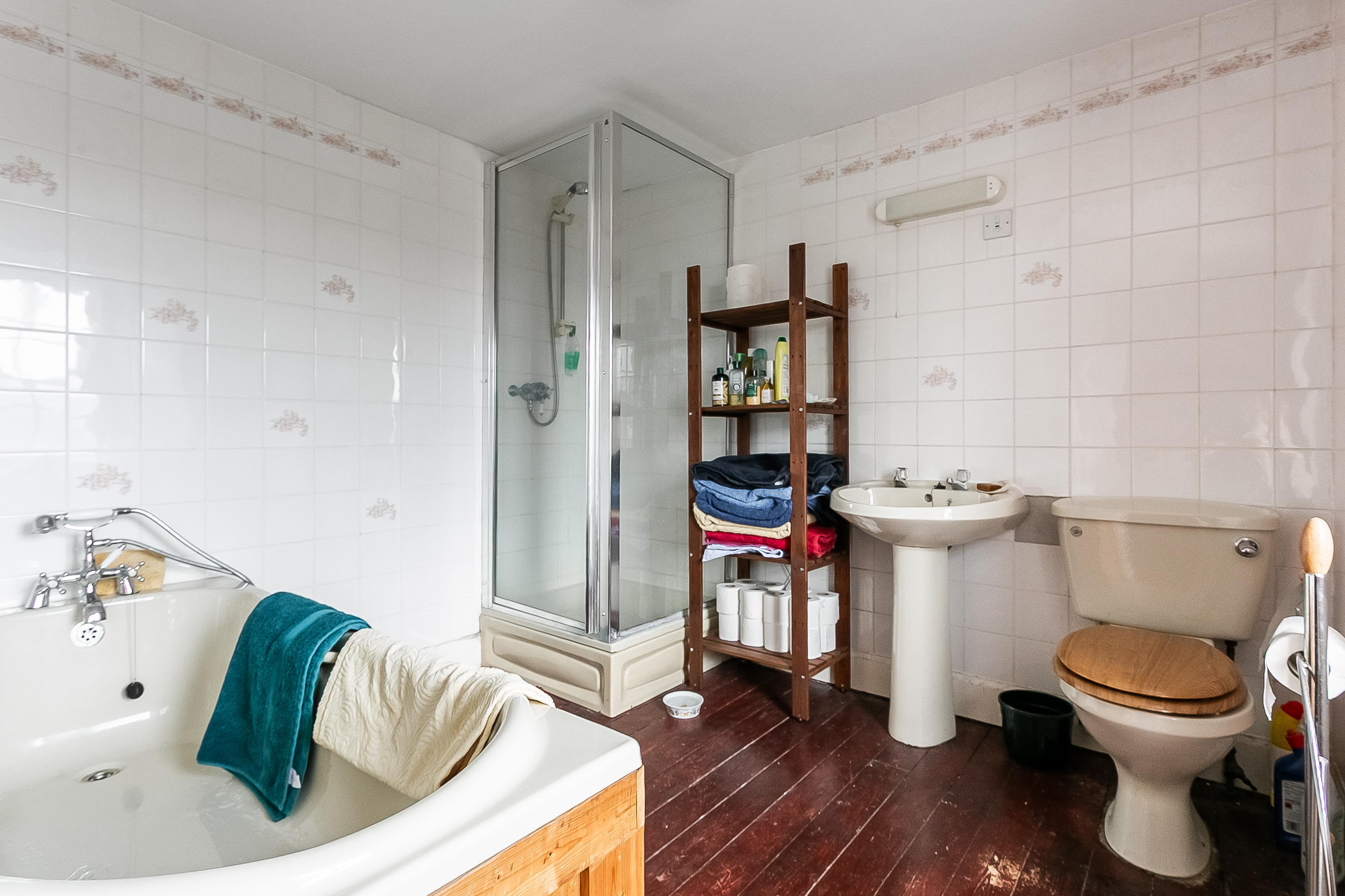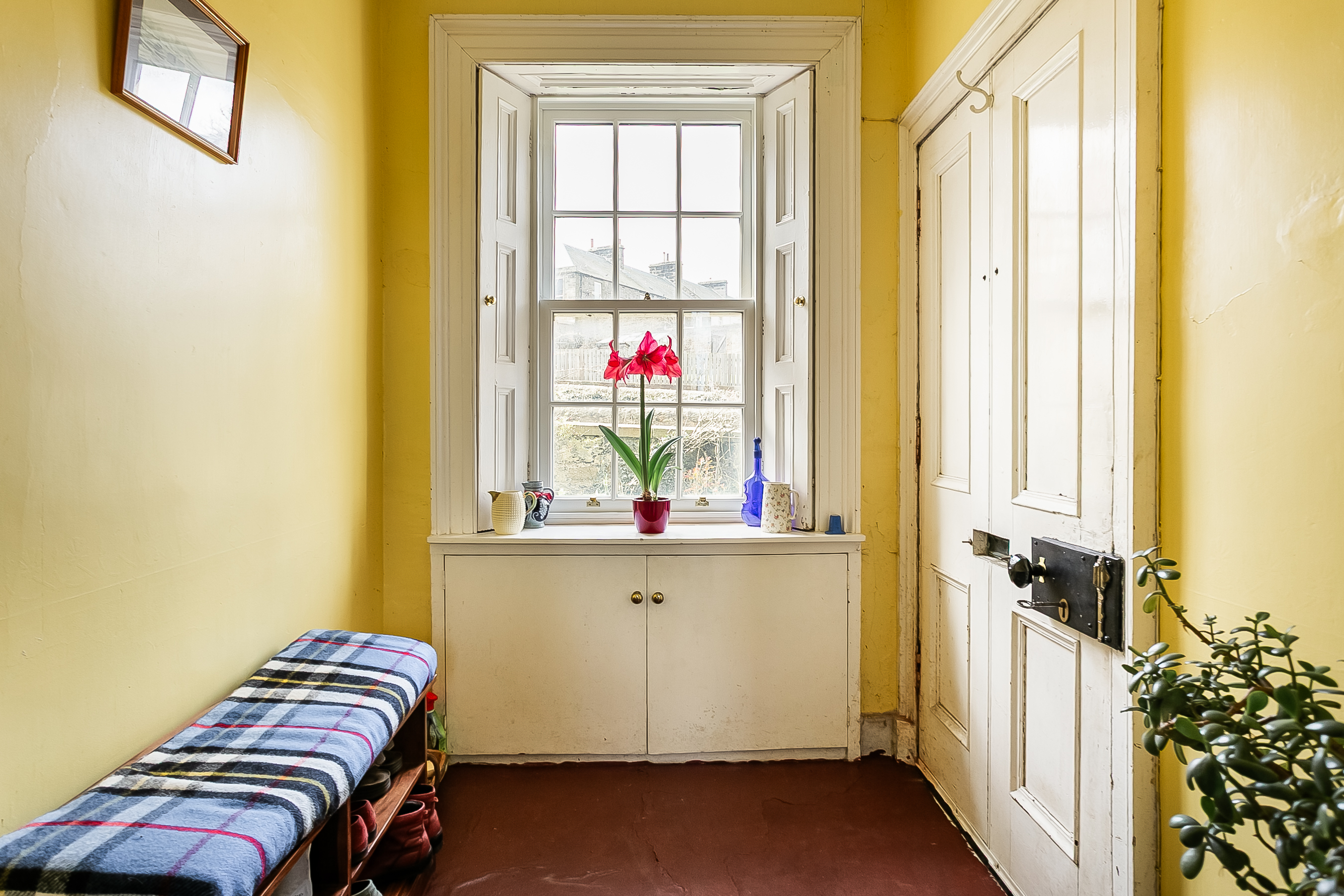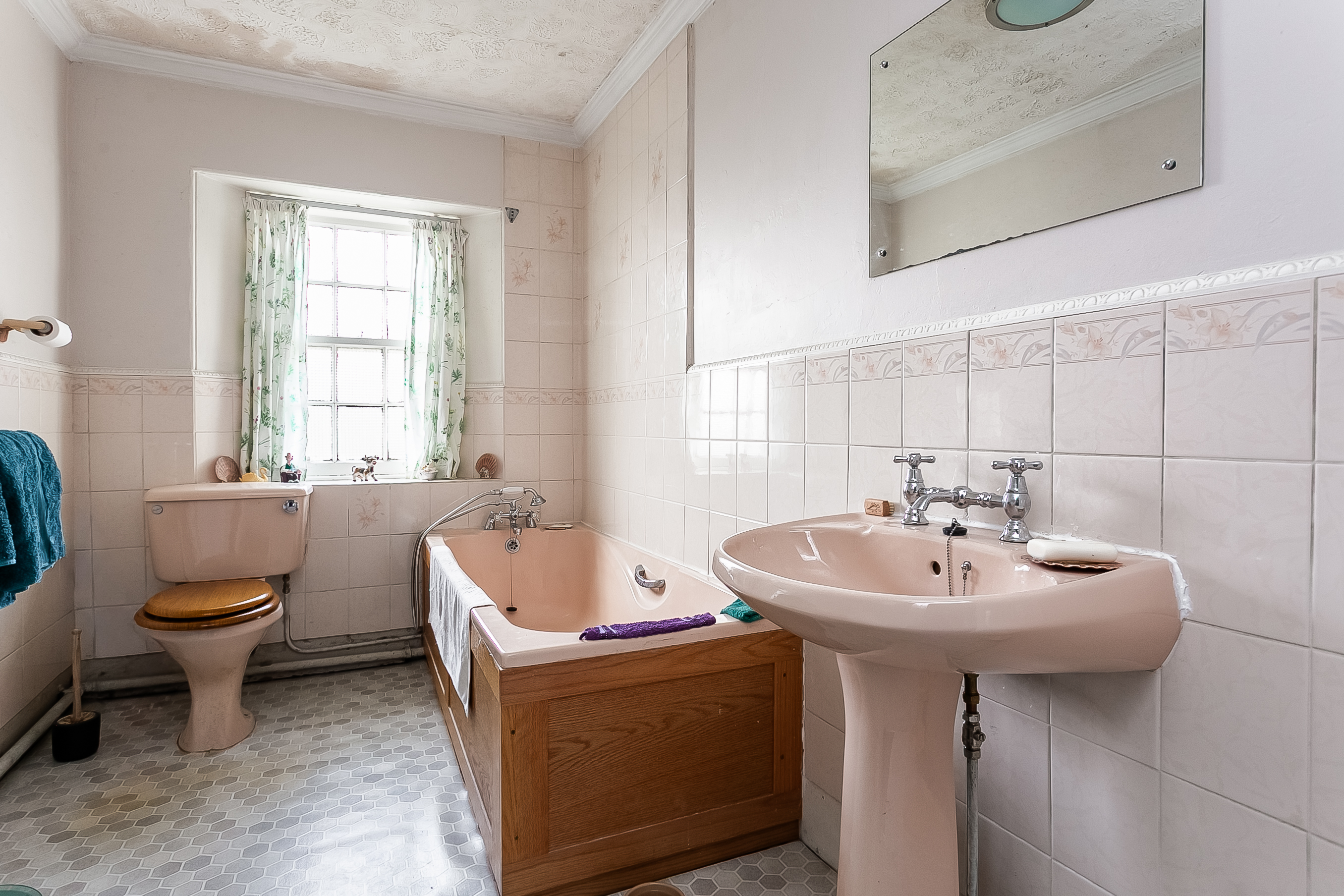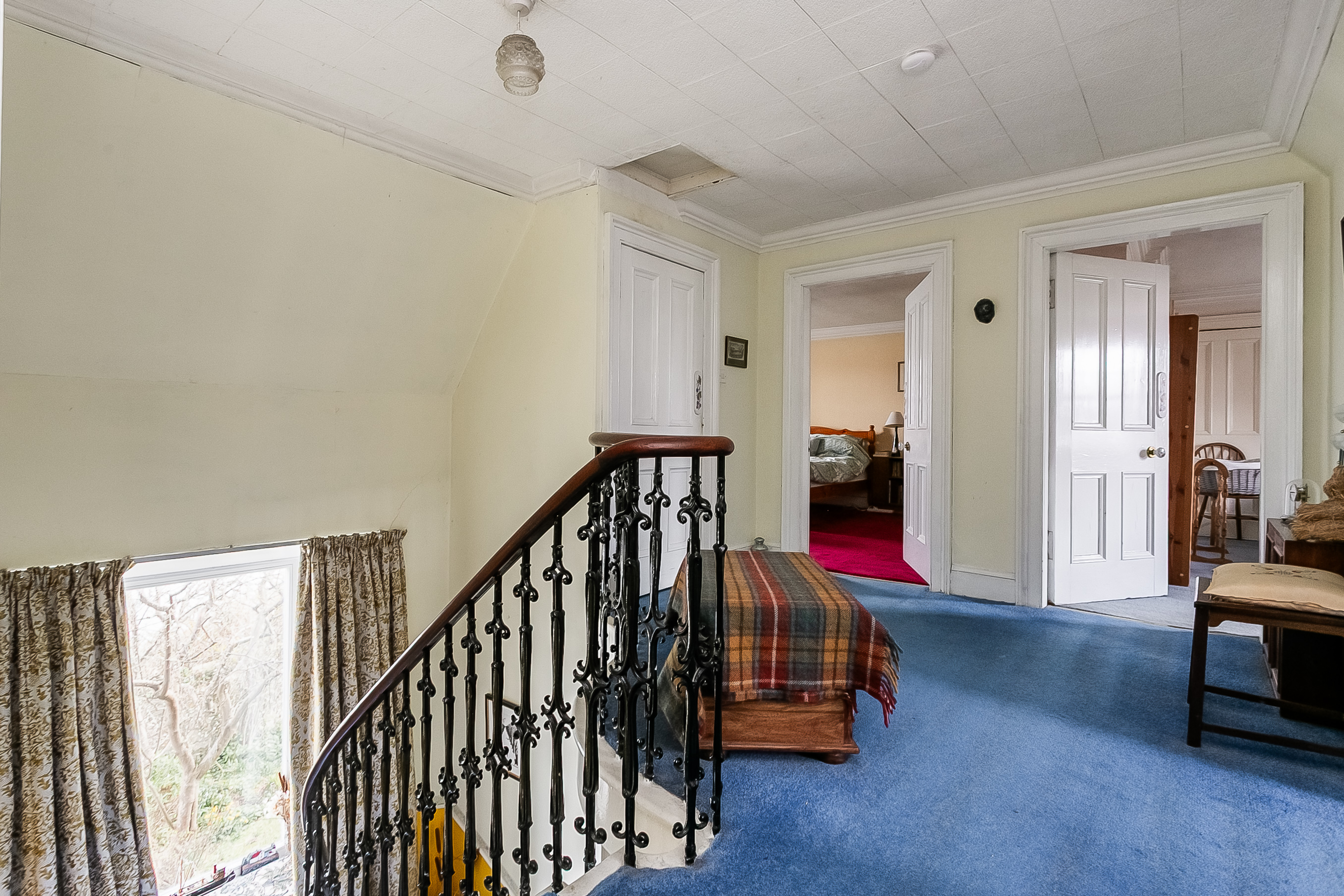 A charming staircase rises to the upper landing, where two particularly spacious double bedrooms are positioned on opposite sides of the property, both benefiting from built-in storage. A further dual-aspect room offers versatility as a playroom, study, or an additional bedroom and leads through to bedroom three.