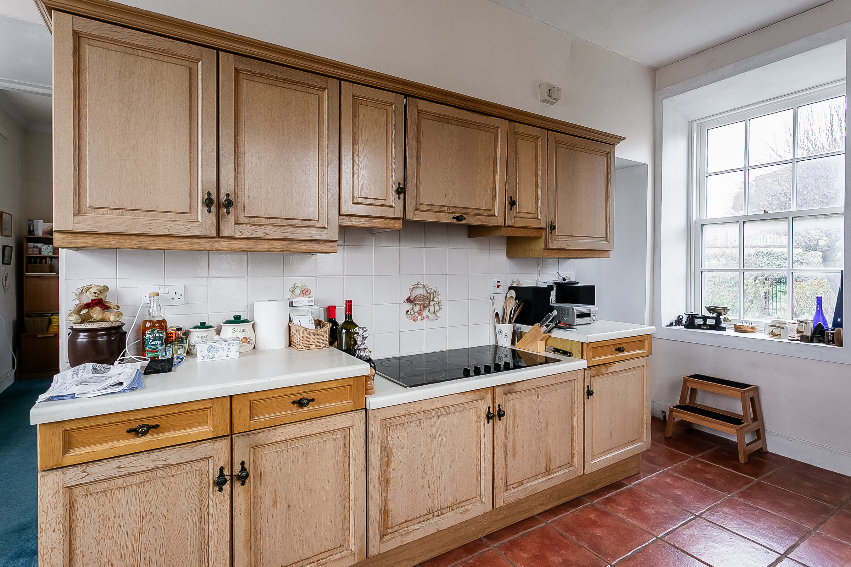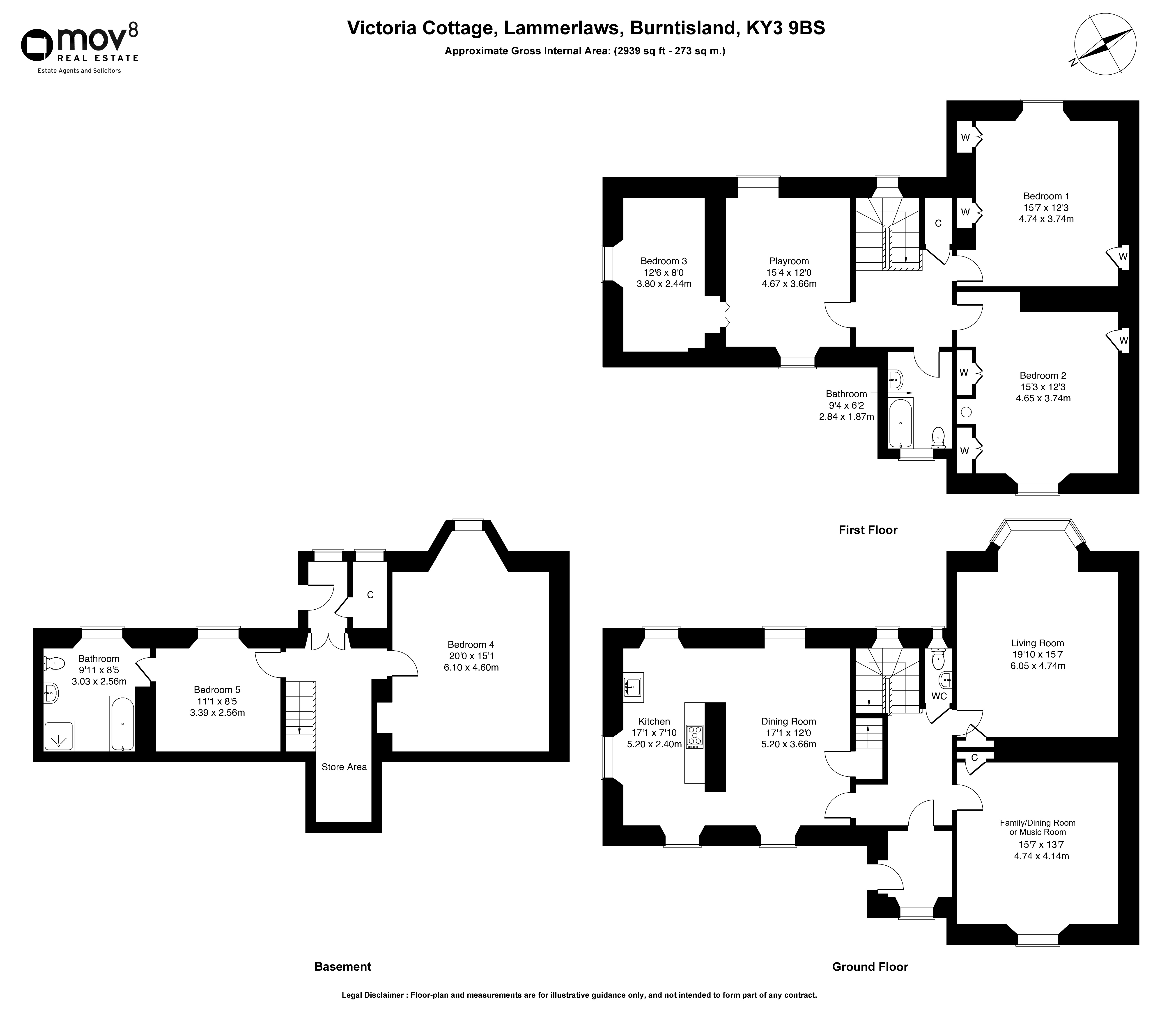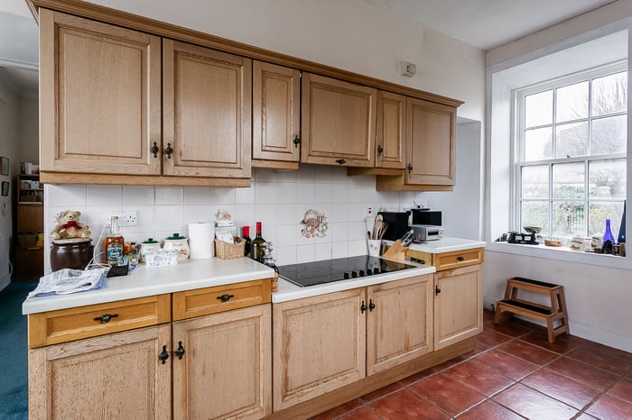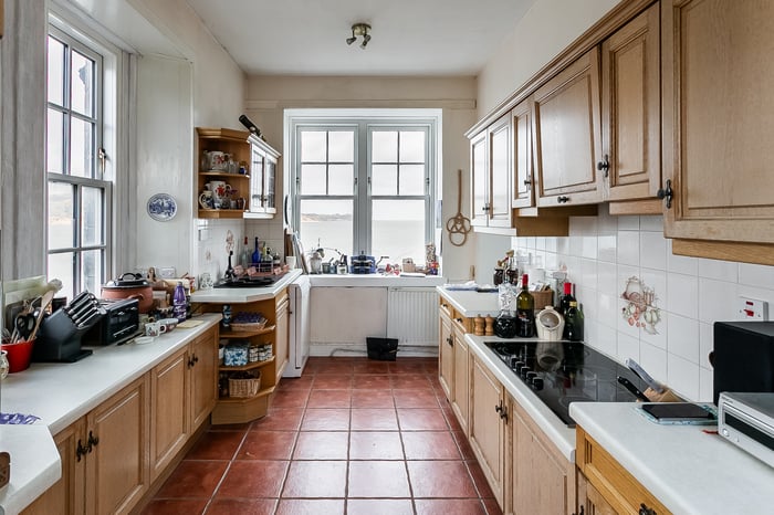 To the front, a versatile music room offers flexibility as a sitting room, family room, or a formal dining space, depending on requirements. The kitchen enjoys a bright triple-aspect orientation, allowing for an abundance of natural light, and is fitted with a range of traditional units and appliances, including a 5-ring electric hob, an eye-level oven, a dishwasher, and a fridge/freezer, with a washing machine housed in the basement.