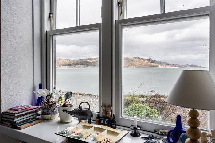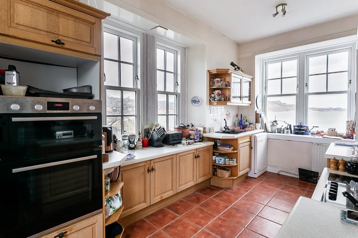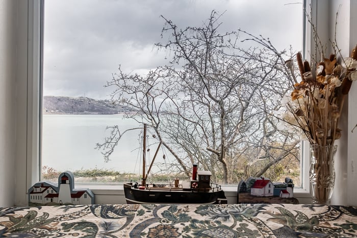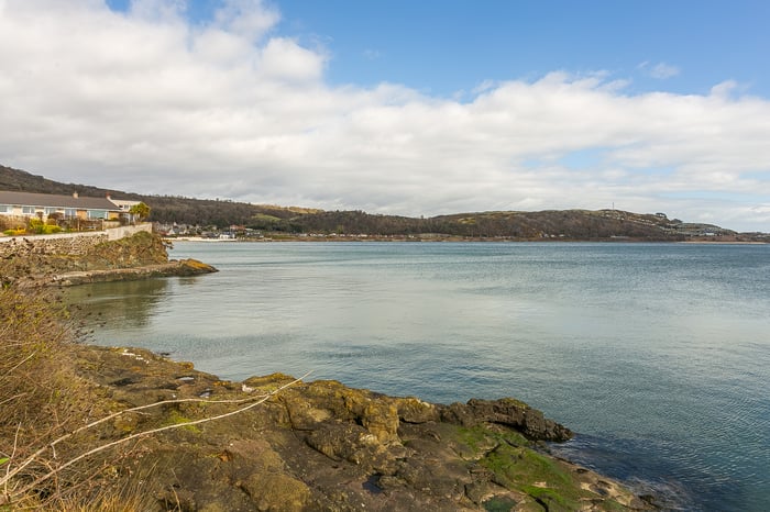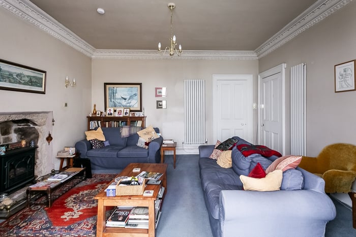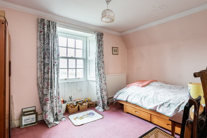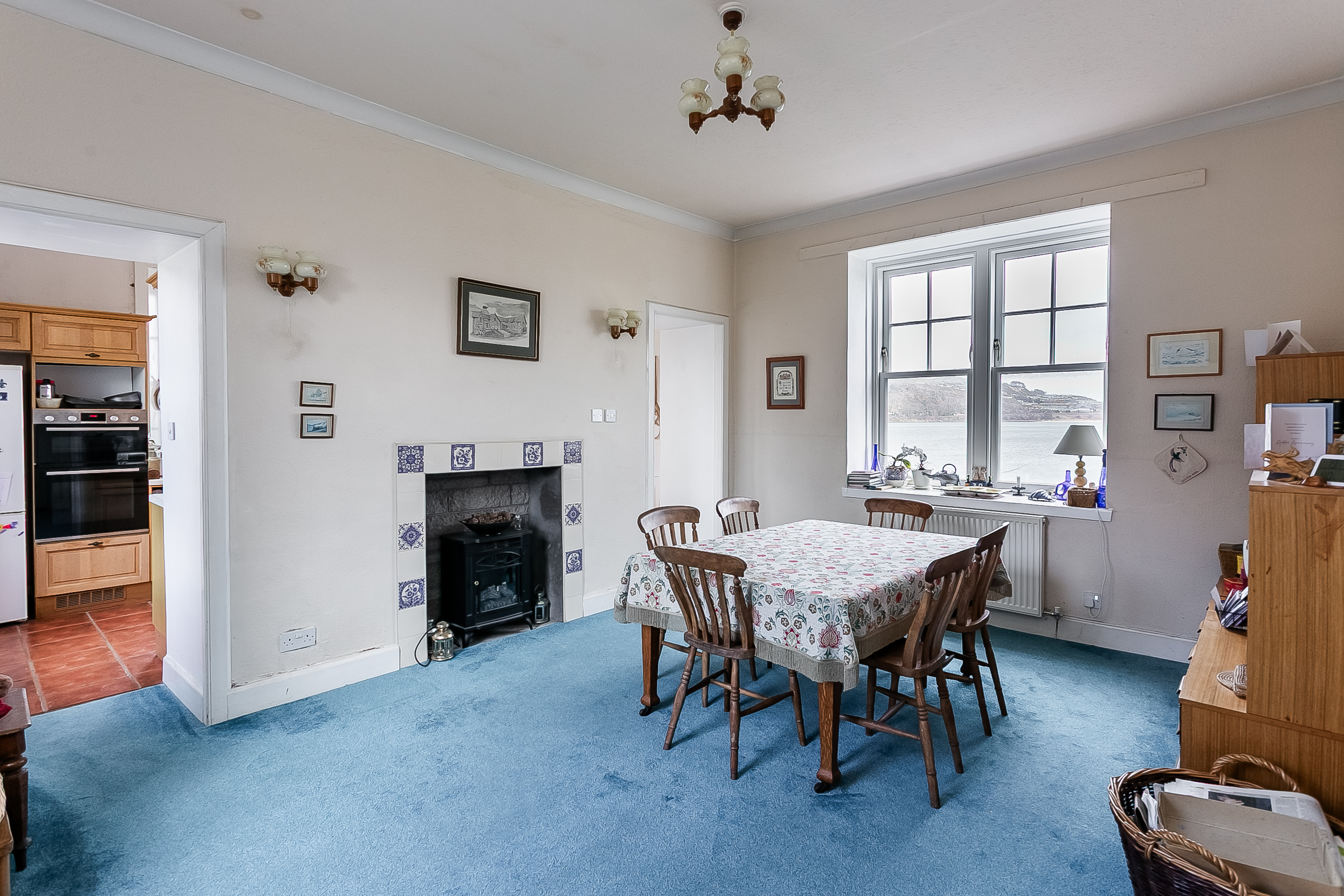 To the rear, the impressive living room is beautifully positioned to take full advantage of the coastal outlook, with a striking bay window framing the views. This elegant space is further enhanced by ornate cornicing and a characterful fireplace with a stone surround and provision for a stove.