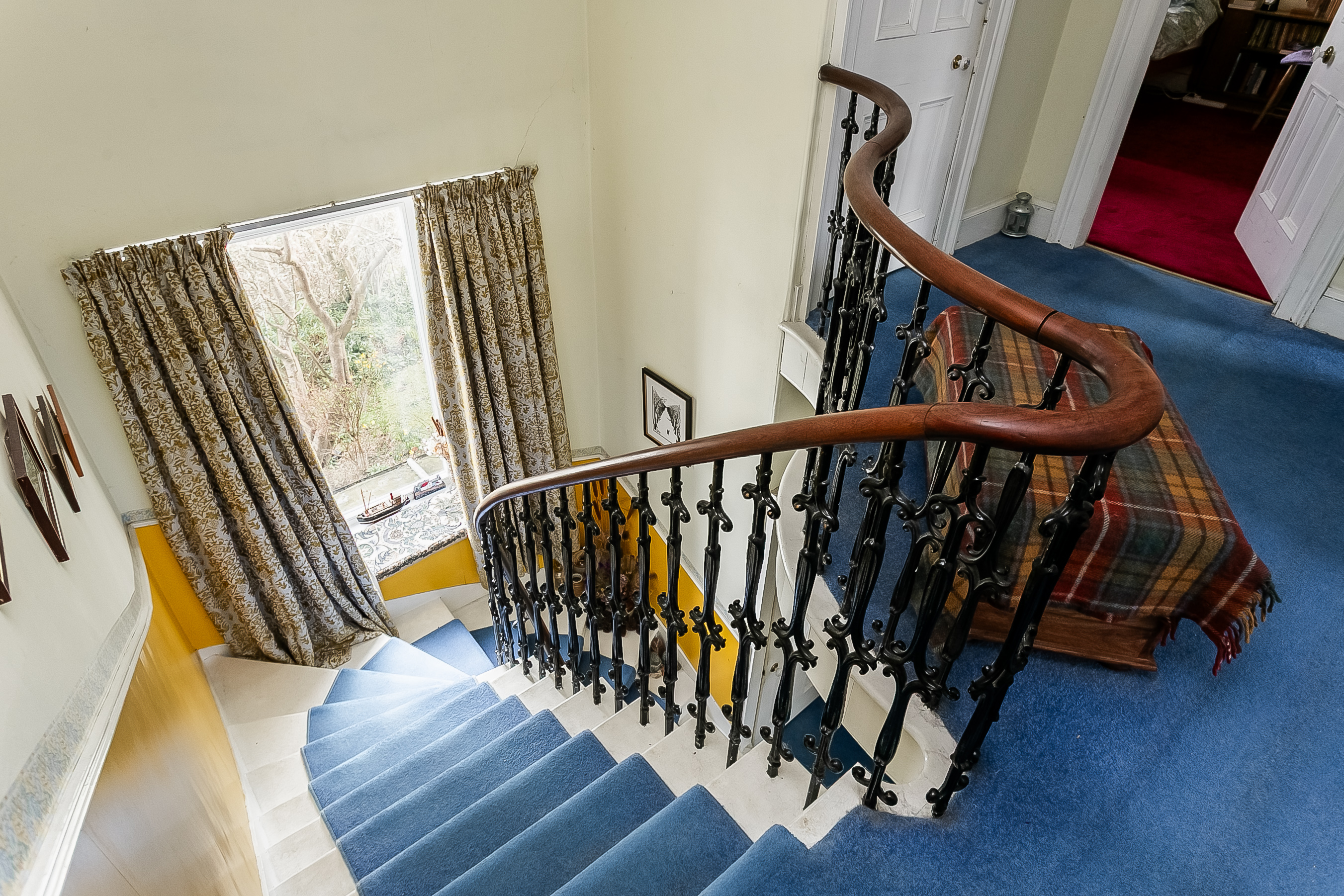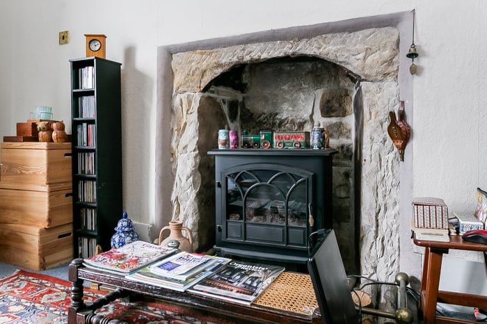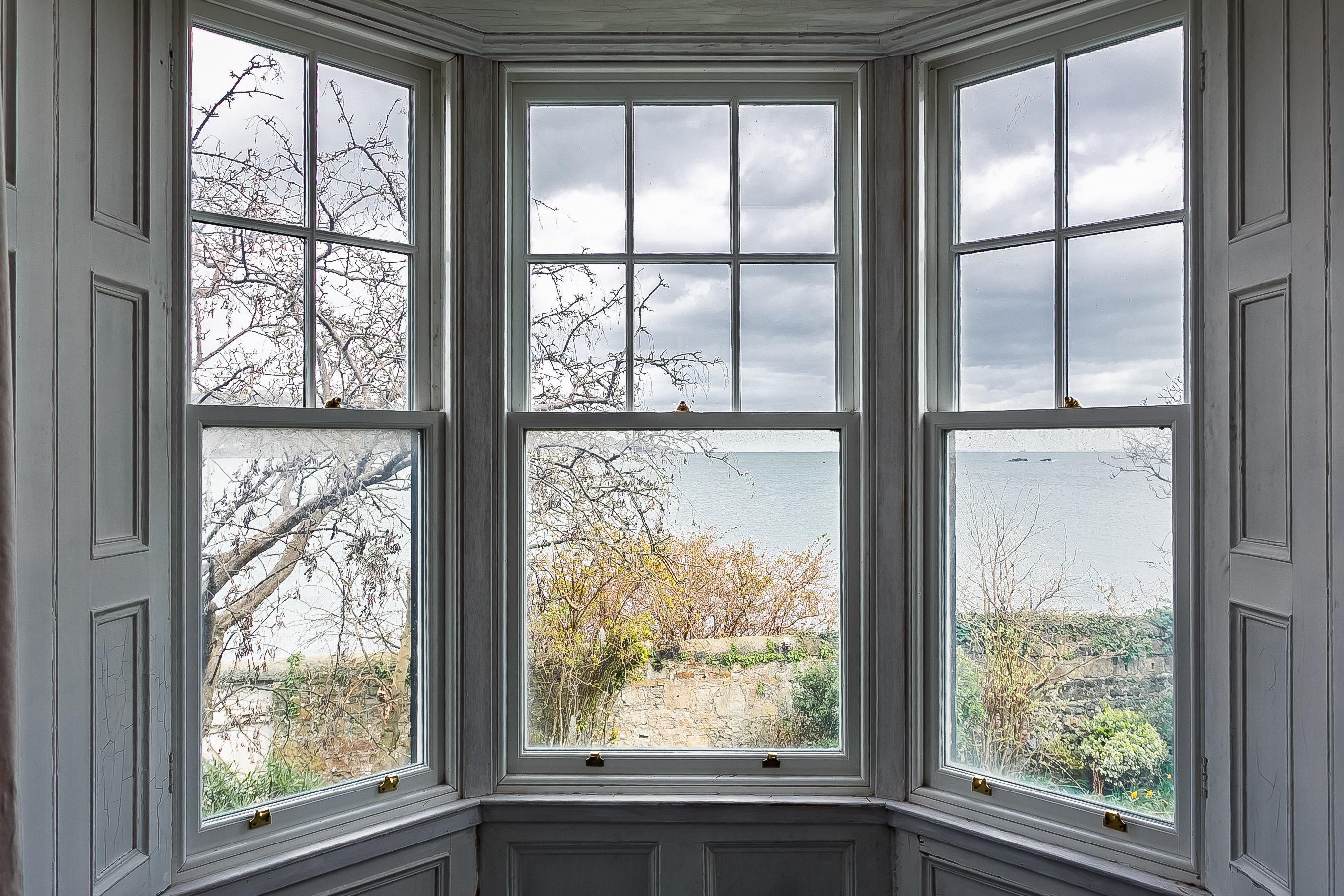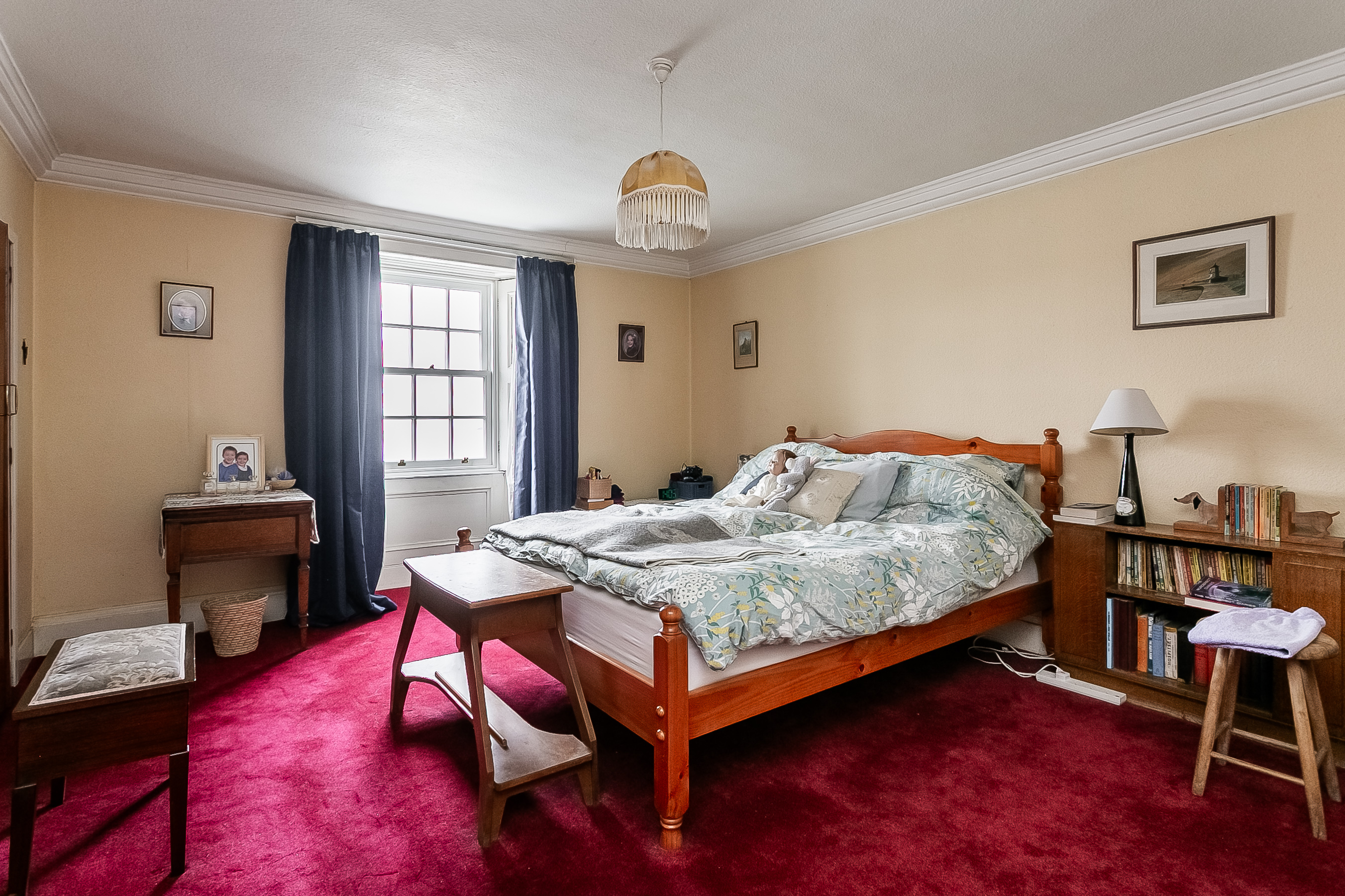 To the rear, the impressive living room is beautifully positioned to take full advantage of the coastal outlook, with a striking bay window framing the views. This elegant space is further enhanced by ornate cornicing and a characterful fireplace with a stone surround and provision for a stove.