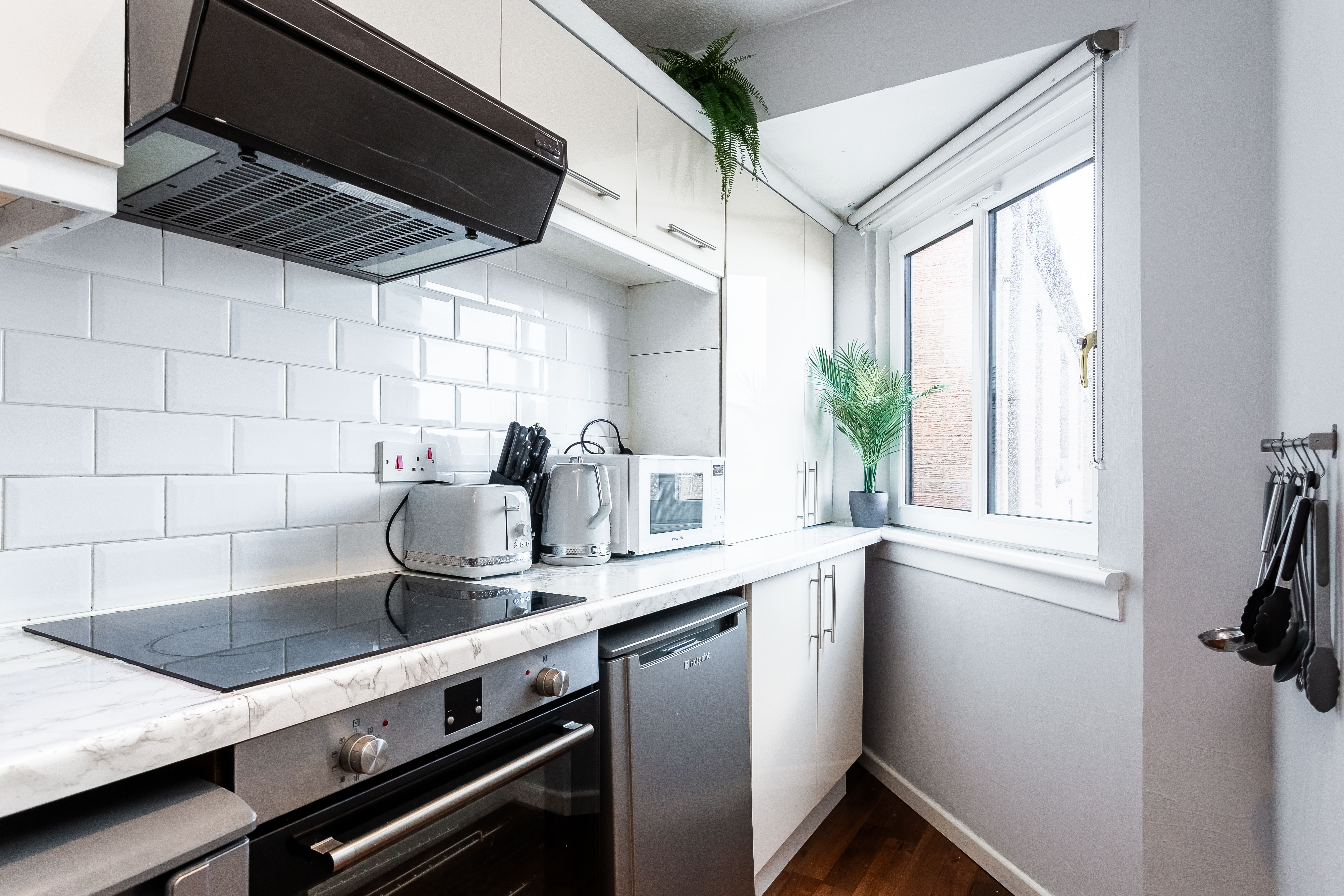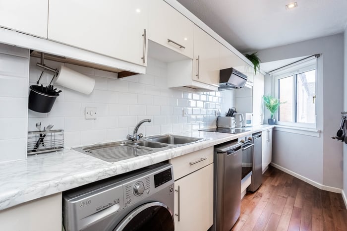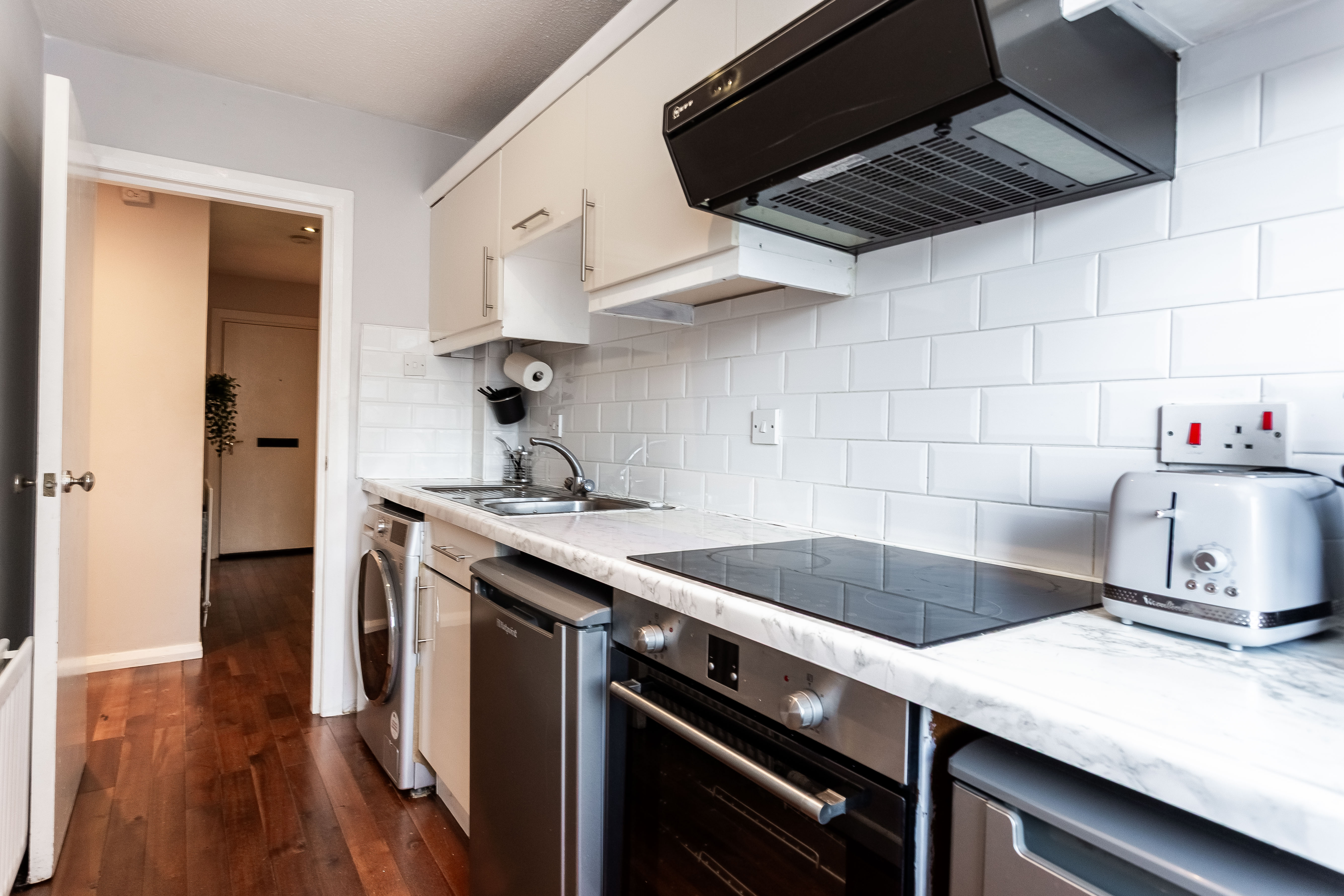It features further hardwood flooring, marble effect worktops, a tiled splashback and contemporary spotlighting. A stainless steel sink with drainer sits beneath the worktop, and the kitchen is well equipped with a fridge, freezer, washing machine, integrated oven and an electric hob with canopy extractor above. The spacious bedroom provides a calm and comfortable retreat, complete with soft carpeted flooring and a central light fitting.