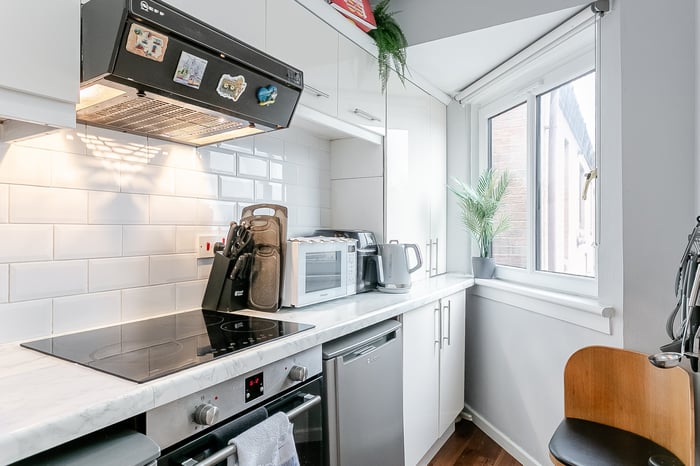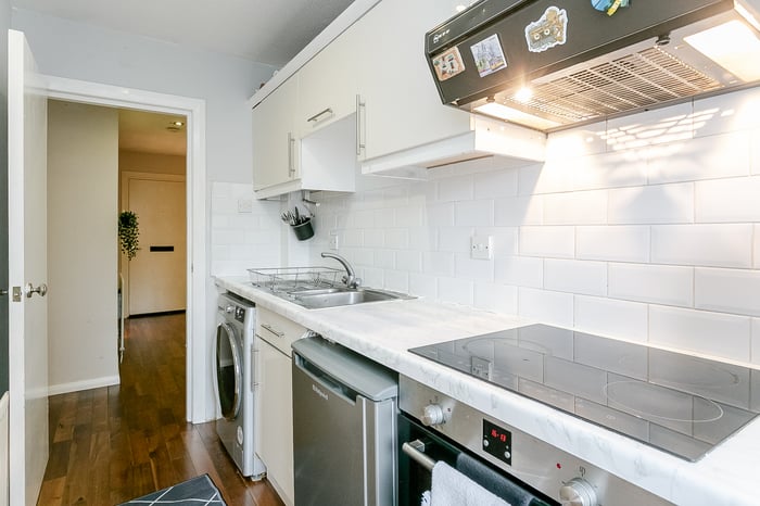 It features further hardwood flooring, marble effect worktops, a tiled splashback and contemporary spotlighting. A stainless steel sink with drainer sits beneath the worktop, and the kitchen is well equipped with a fridge, freezer, washing machine, integrated oven and an electric hob with canopy extractor above. The spacious bedroom provides a calm and comfortable retreat, complete with soft carpeted flooring and a central light fitting.