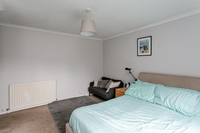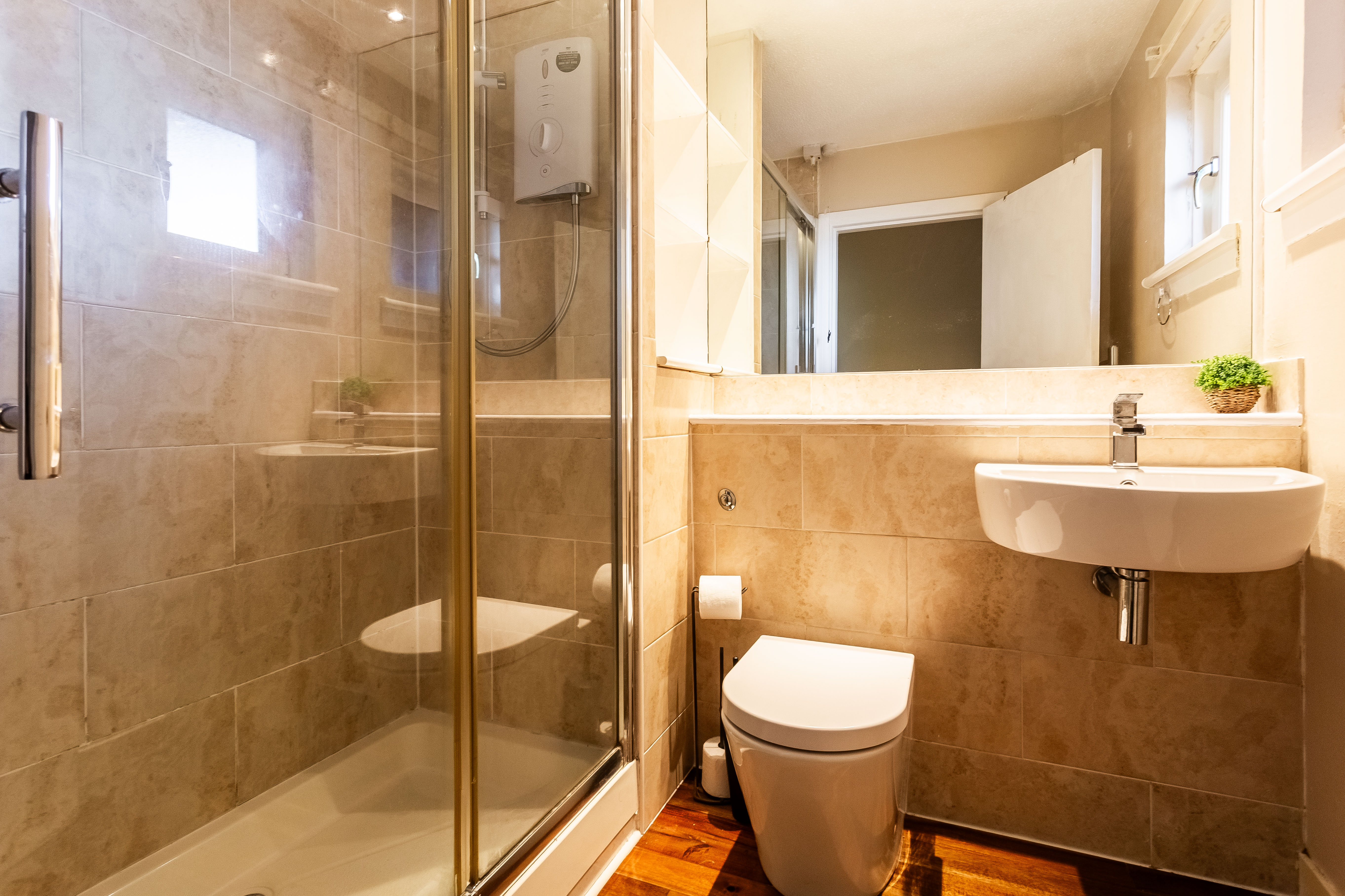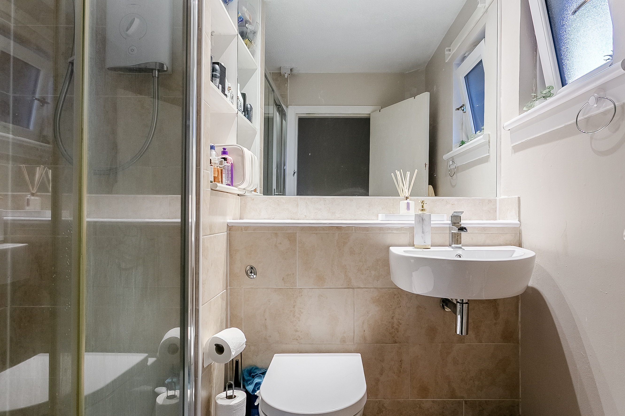 There is ample room for additional furniture alongside a generous built-in wardrobe with mirrored sliding doors, which enhances both storage and the sense of space. Completing the property is a modern fitted shower room, finished with hardwood flooring, a tiled splashback surround and sleek spotlighting, offering a clean and contemporary feel.