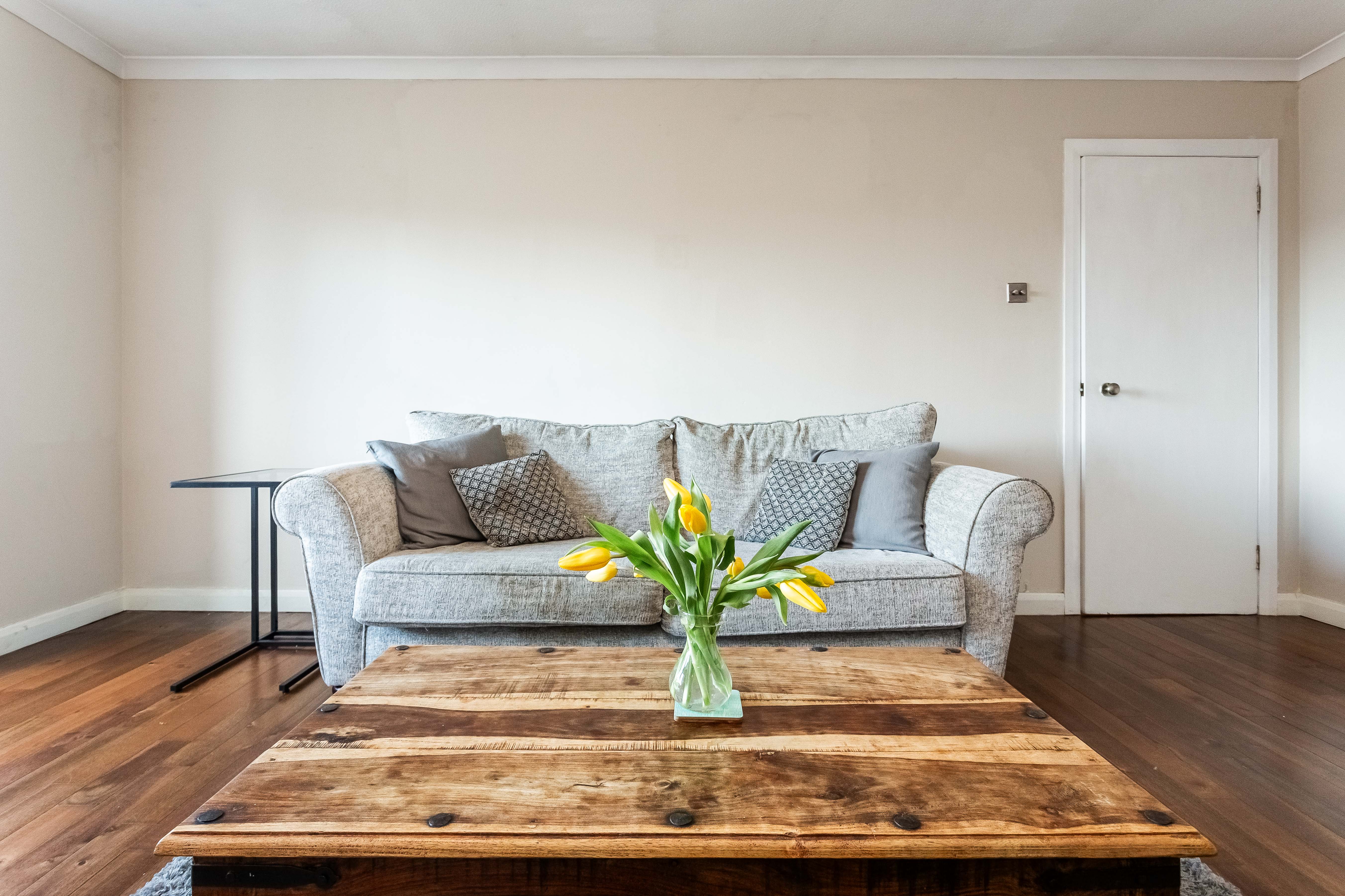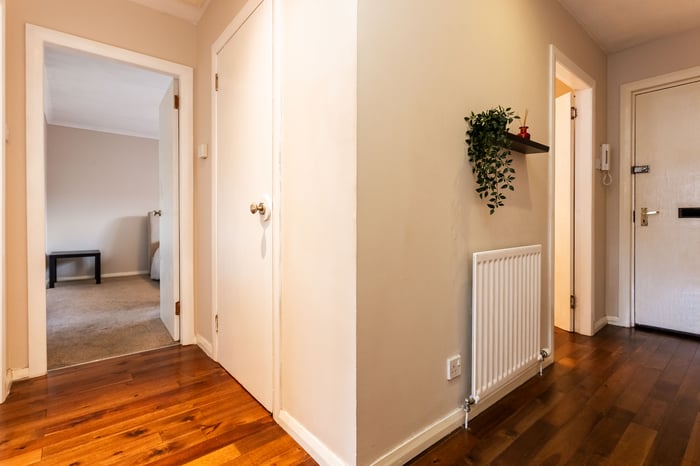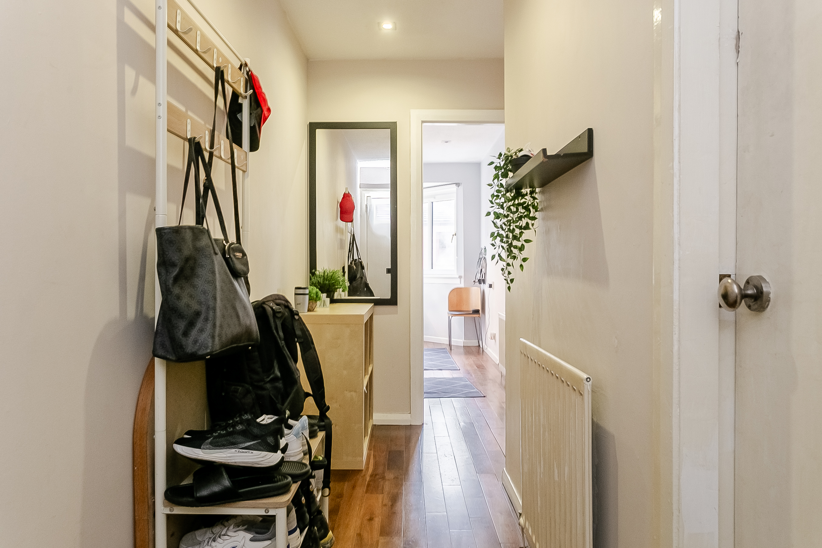 The welcoming entrance hall is finished with continuous hardwood flooring, creating a seamless flow throughout the property and providing access to all rooms. A built-in storage cupboard offers practical and discreet space for everyday essentials.