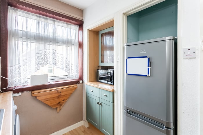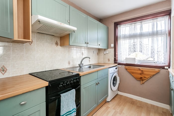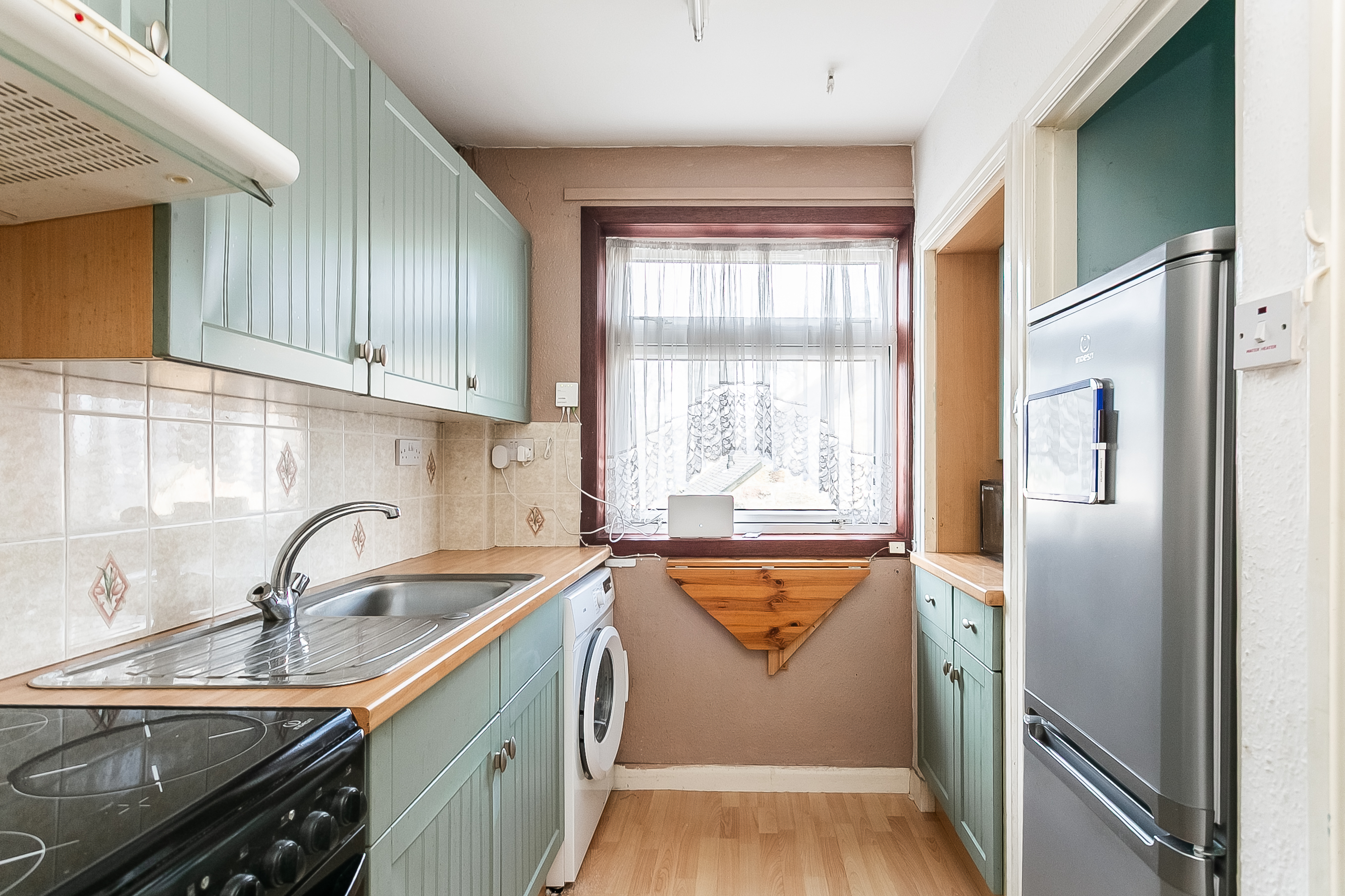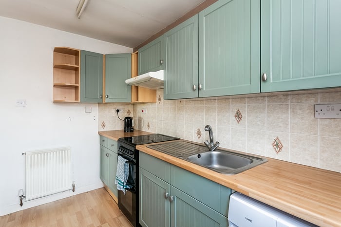Located to the rear, the kitchen enjoys a side-aspect window and is fitted with contemporary wall and base units complemented by wood-effect worktops and a tiled surround. A sink with a drainer is in place, along with a range of freestanding appliances, including an electric cooker, fridge/freezer, and washing machine.