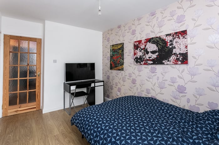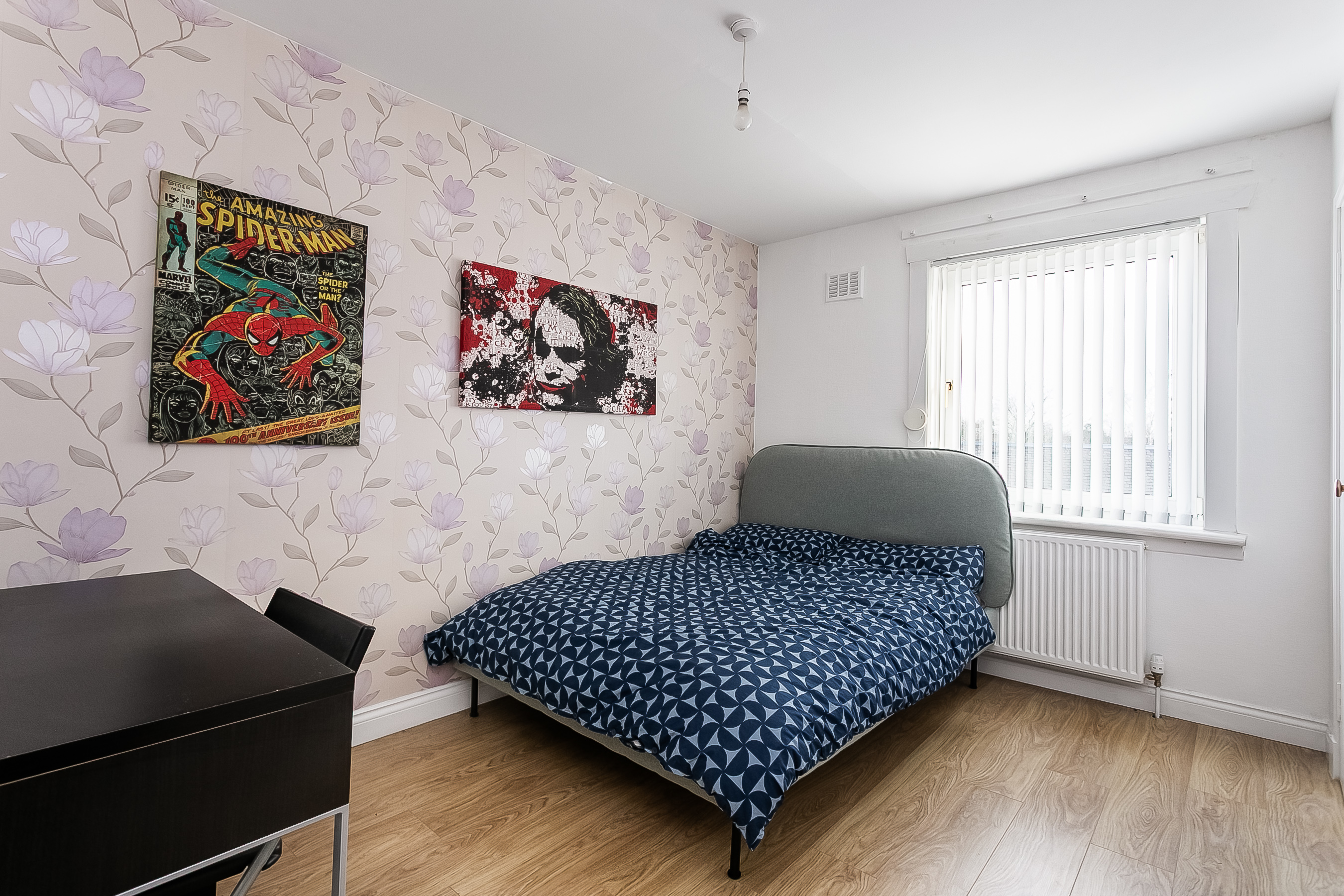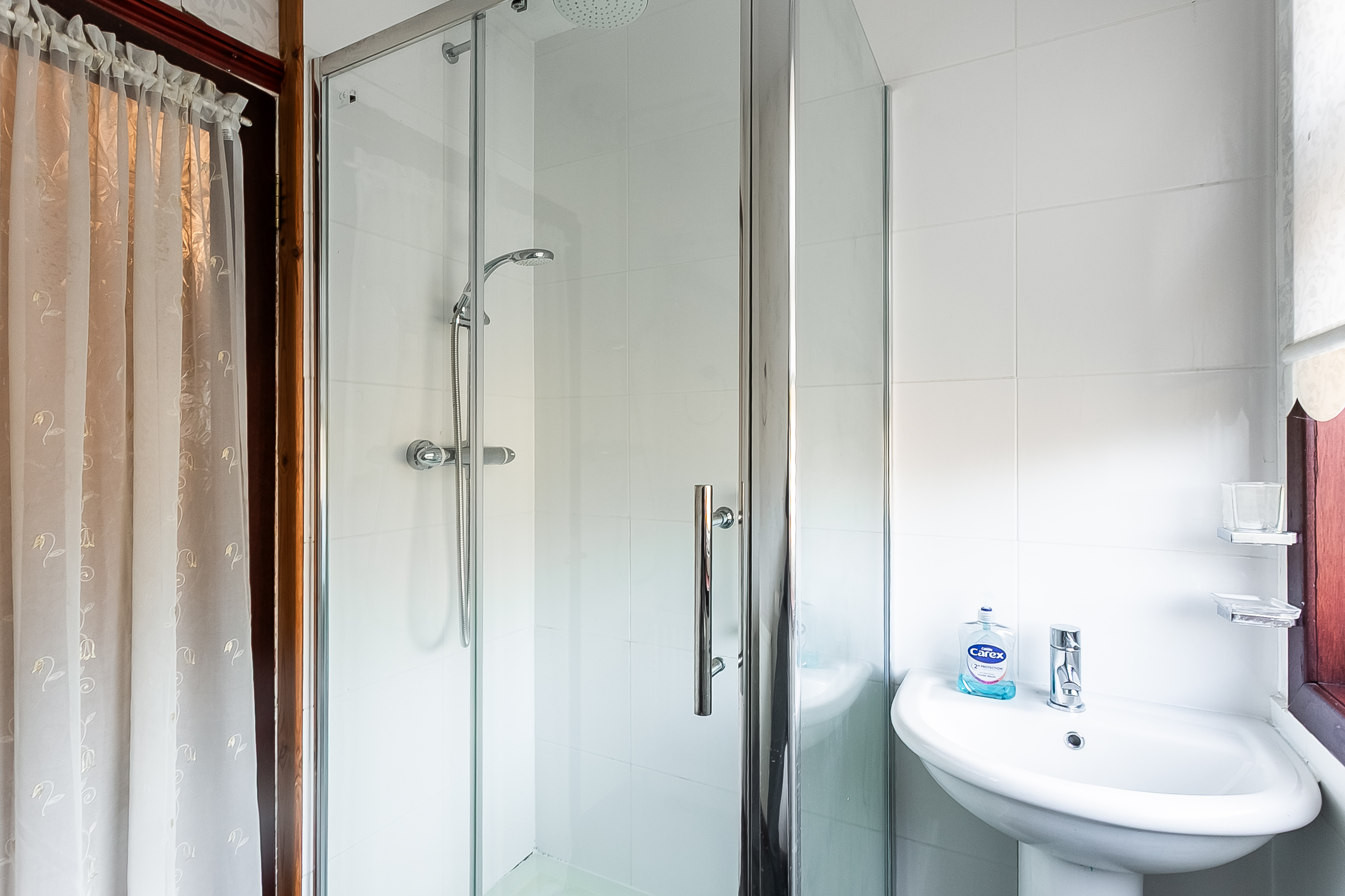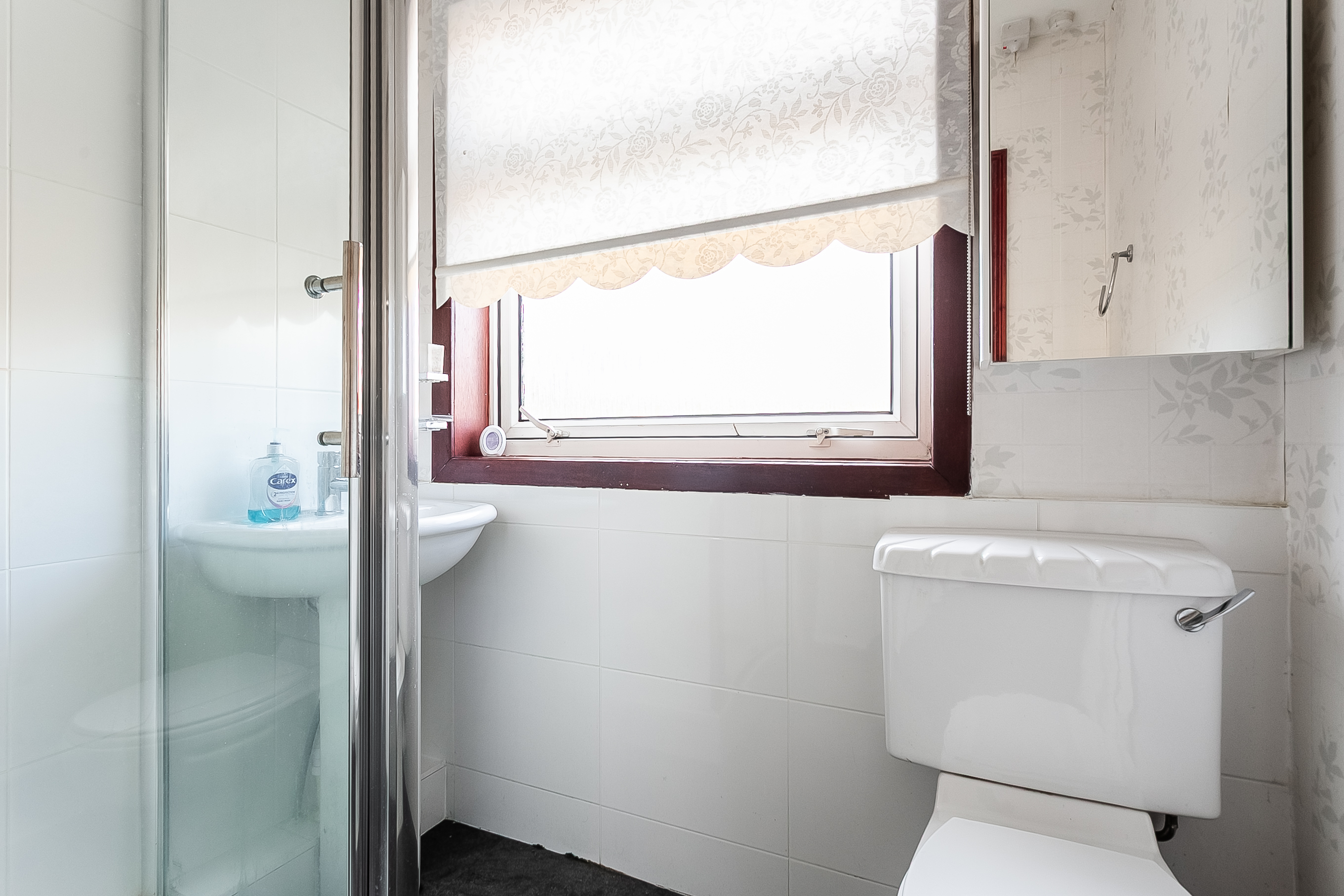 The front-facing double bedroom is well-sized and features wood-effect flooring together with excellent storage provision, including two built-in wardrobes. Completing the accommodation, the shower suite includes a mains shower and splash walls.