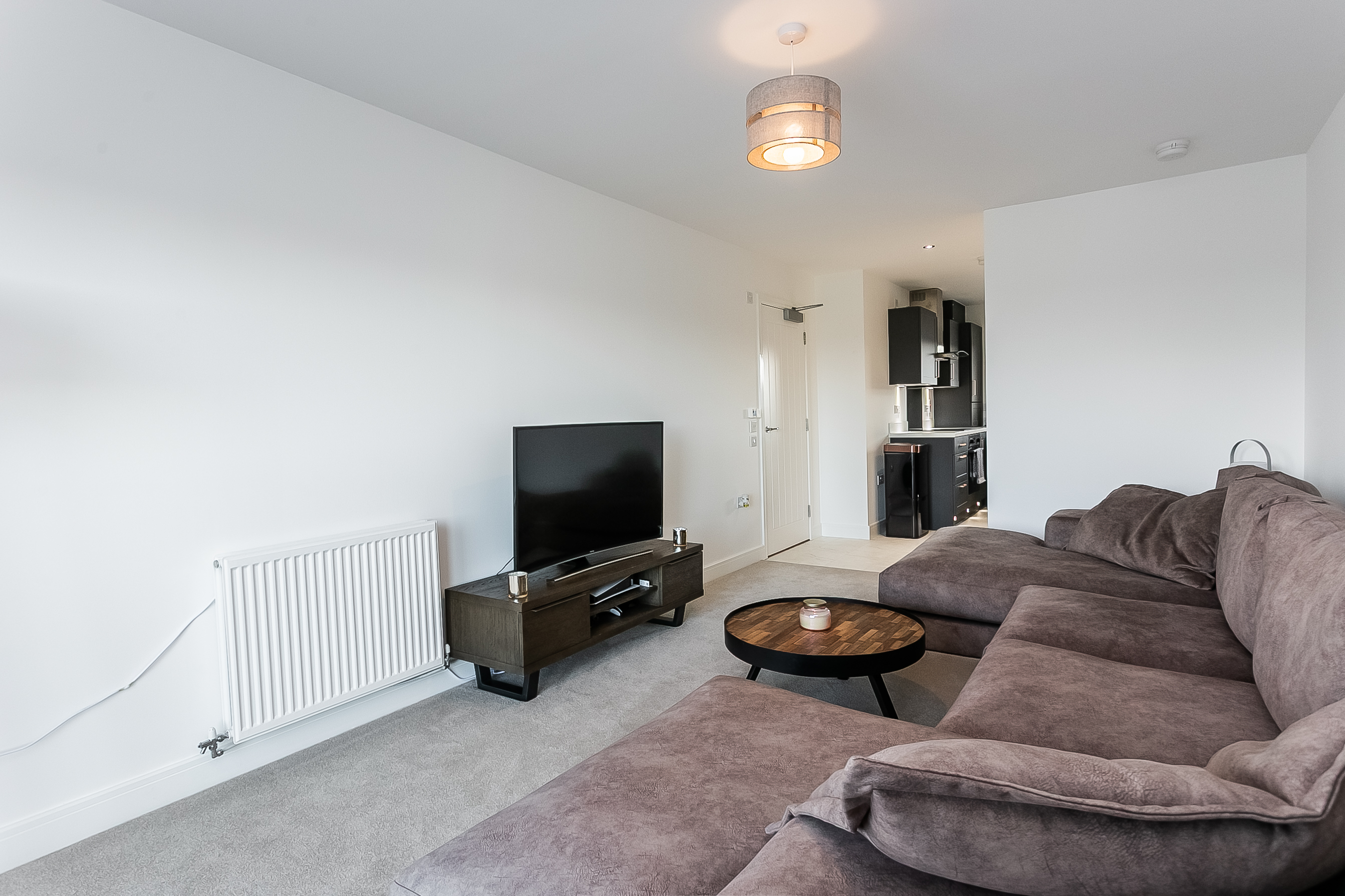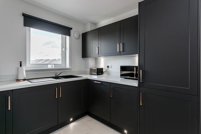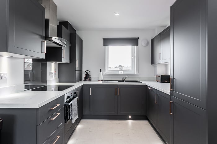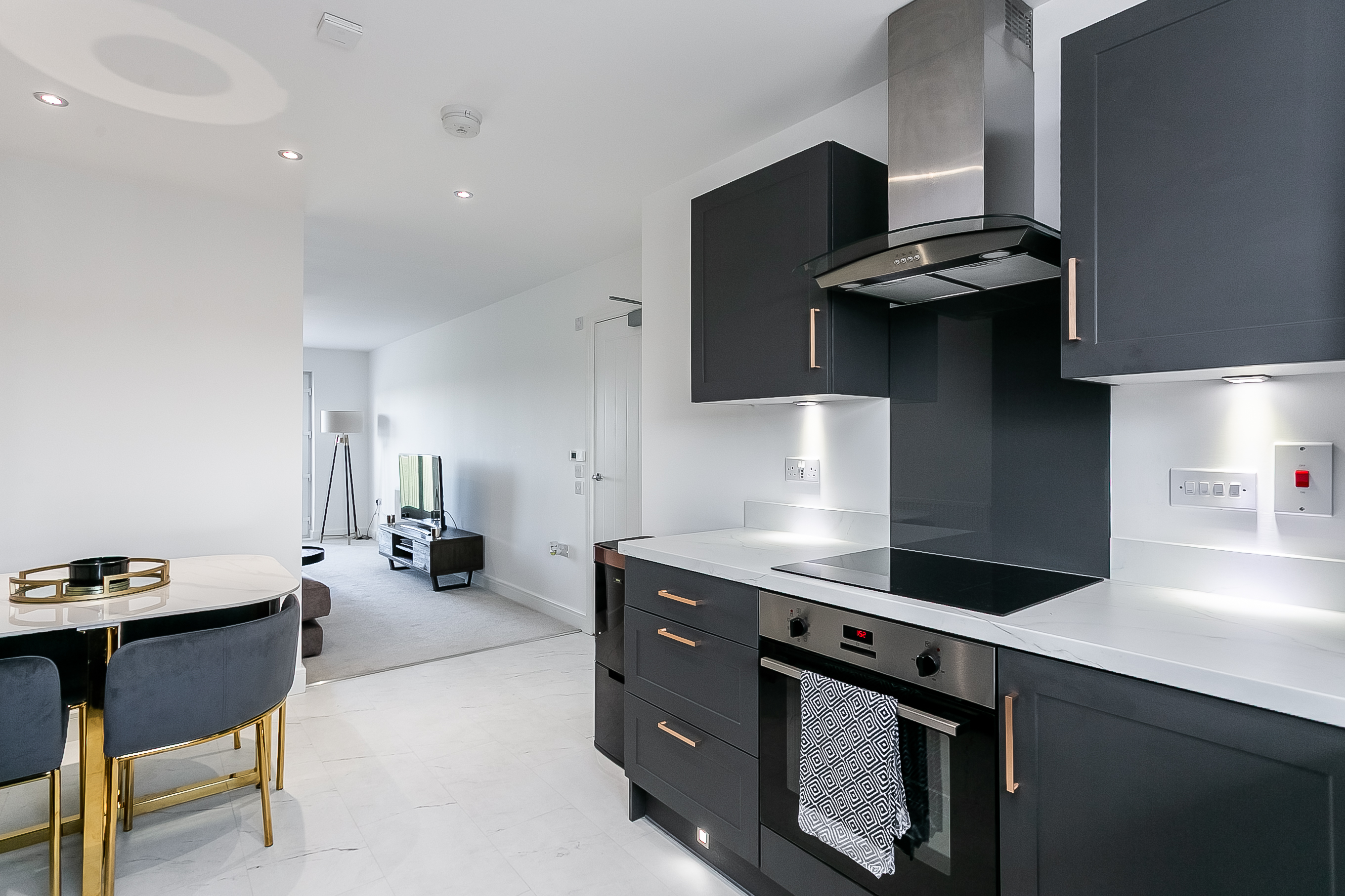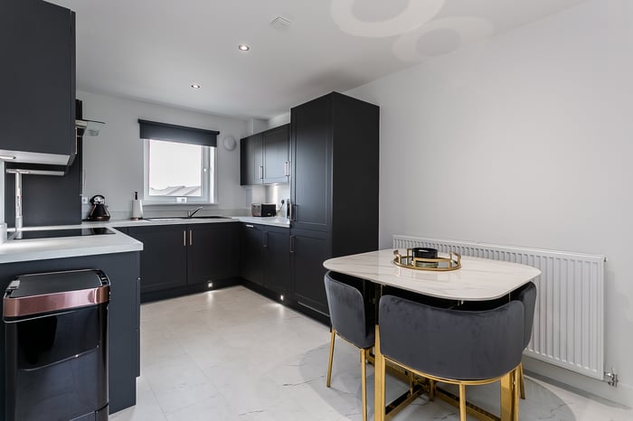The lounge area offers comfortable space for relaxing and entertaining, while the dining area flows seamlessly into a stylish kitchen. Finished with durable Moduleo flooring, the kitchen is fitted with modern units, marble-effect worktops and matching upstands, a sink with a drainer, along with a full range of integrated appliances including an induction hob, oven, fridge/freezer, washing machine and dishwasher.