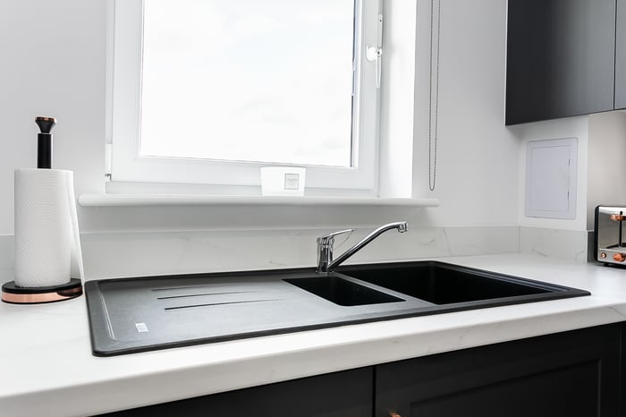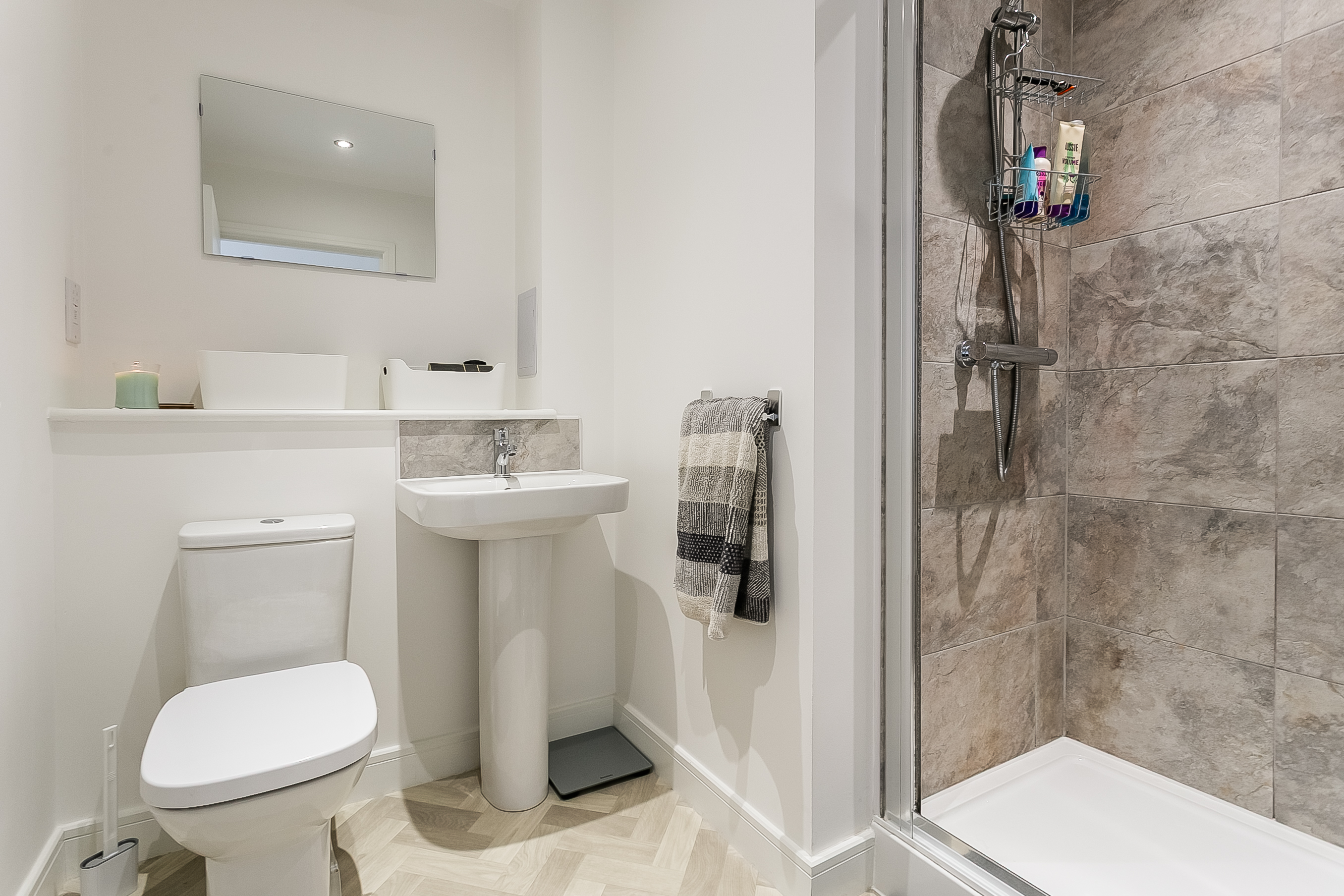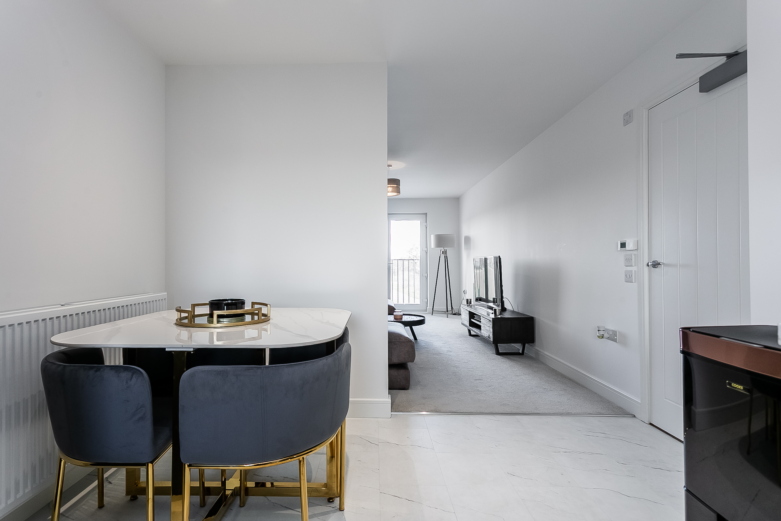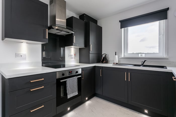 The lounge area offers comfortable space for relaxing and entertaining, while the dining area flows seamlessly into a stylish kitchen. Finished with durable Moduleo flooring, the kitchen is fitted with modern units, marble-effect worktops and matching upstands, a sink with a drainer, along with a full range of integrated appliances including an induction hob, oven, fridge/freezer, washing machine and dishwasher.
