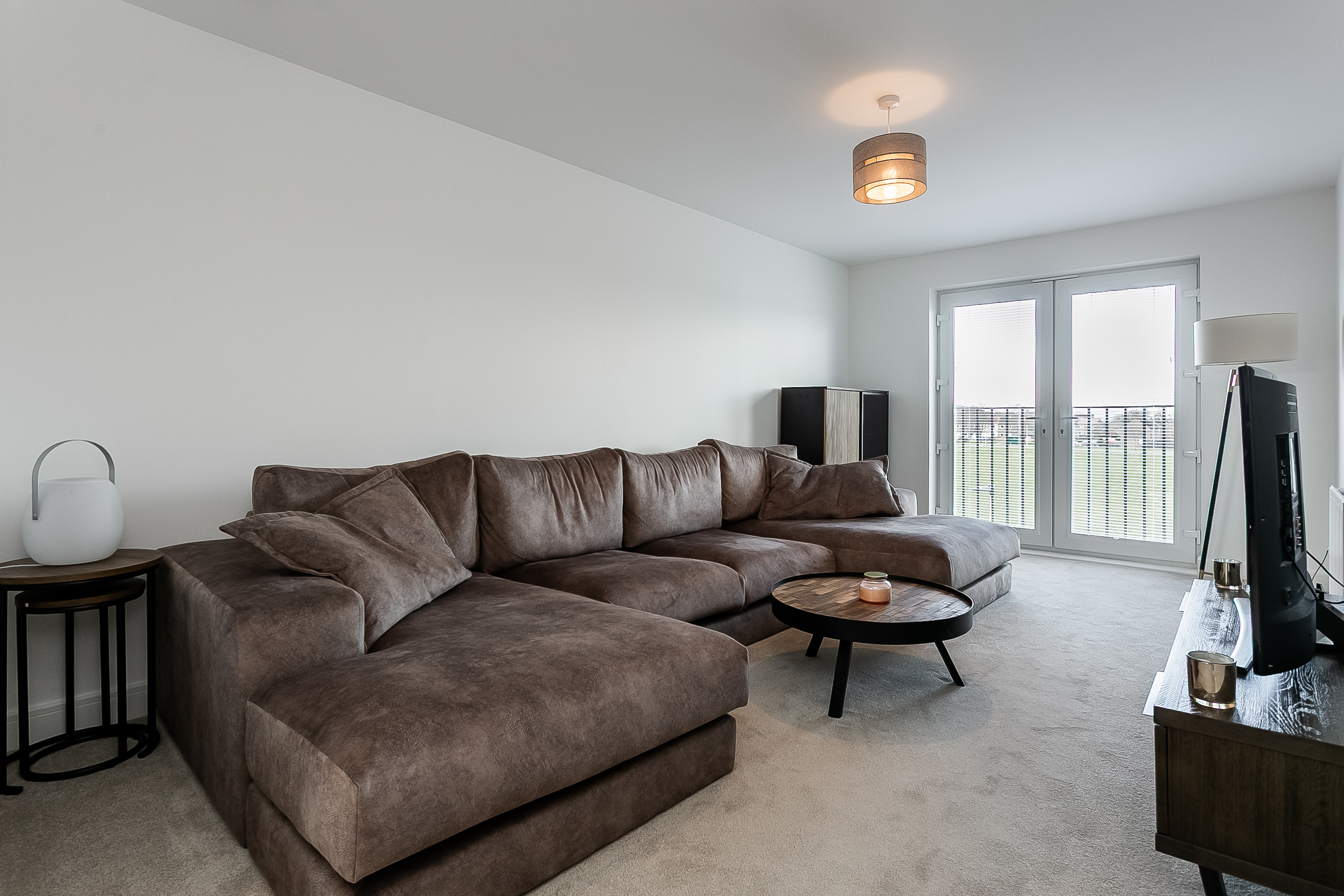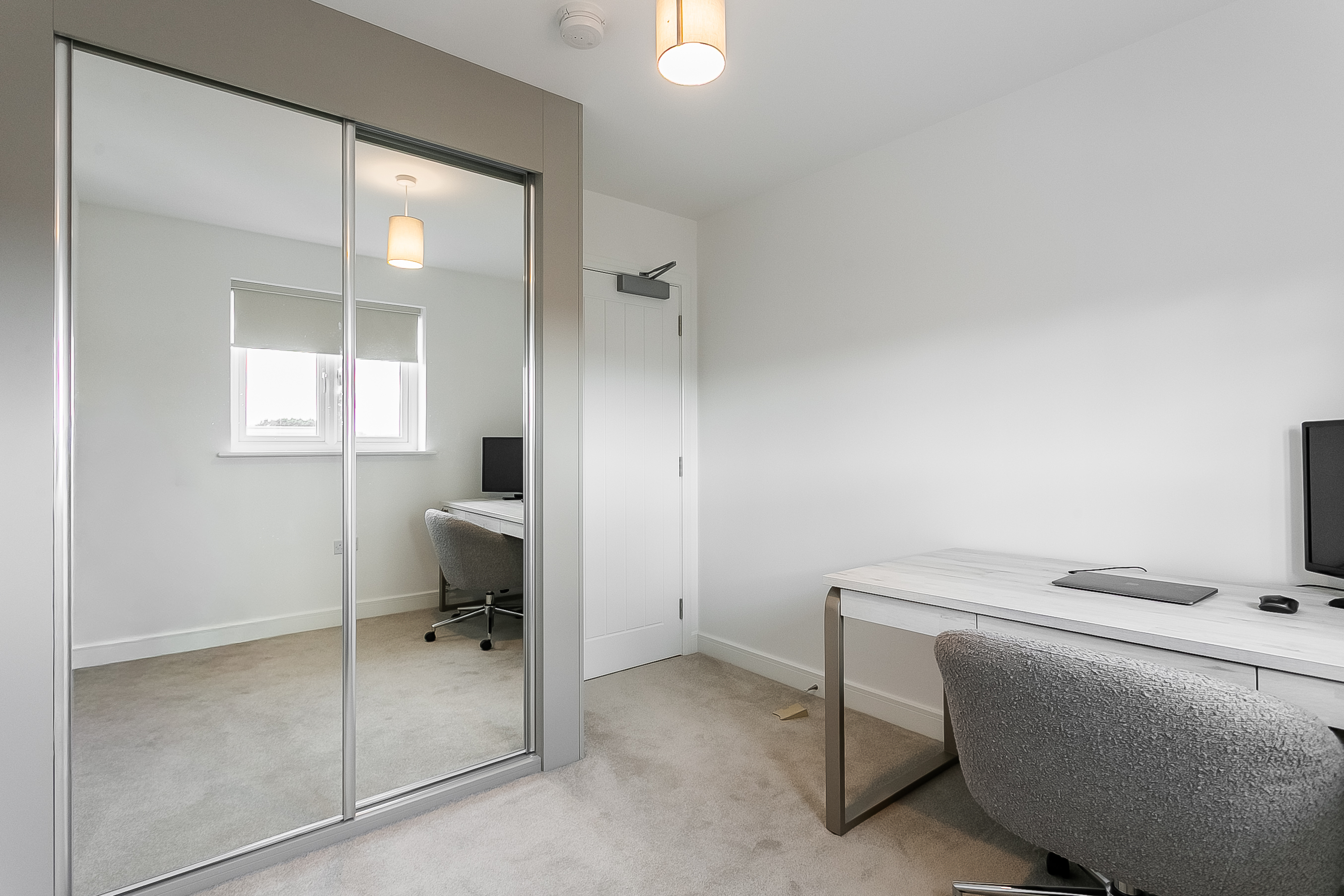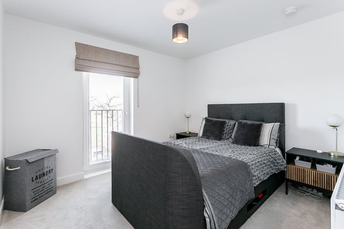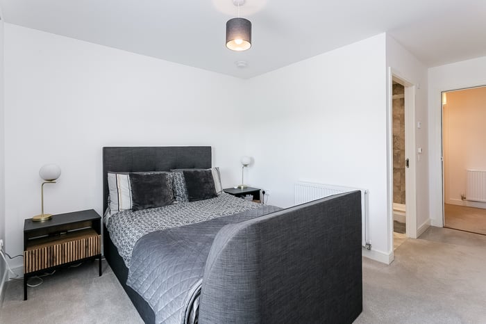 The generous master bedroom is tastefully decorated and features carpeting along with a modern en-suite shower room. A second well-proportioned bedroom, also finished in light neutral tones, benefits from a built-in mirrored wardrobe.