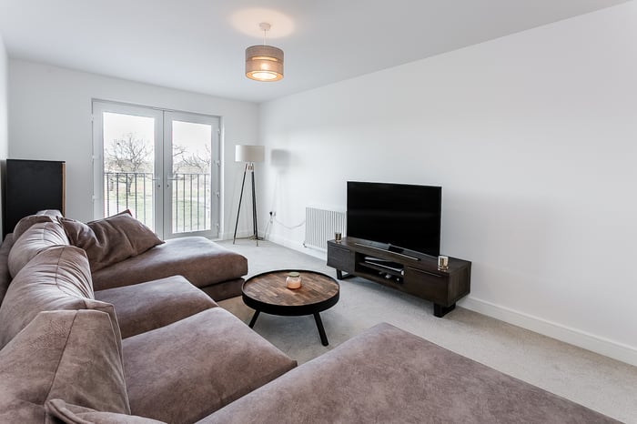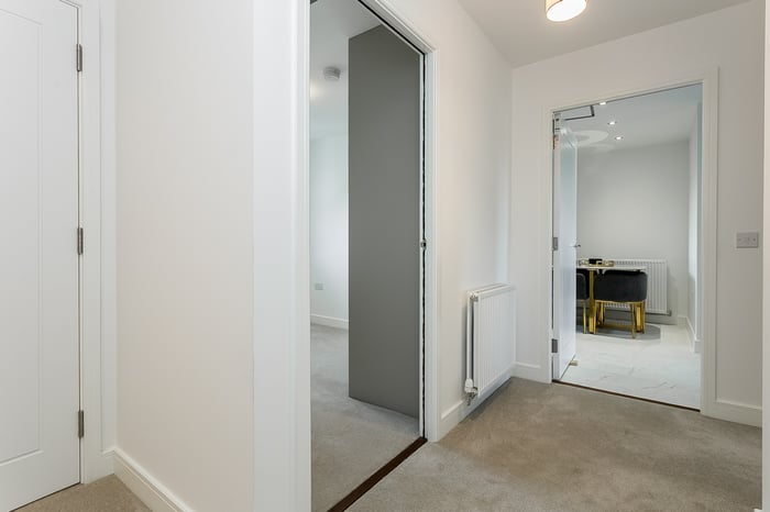 A welcoming entrance hall provides access to all rooms and benefits from two useful storage cupboards. Stretching the full length of the home, an impressive dual-aspect semi-open-plan living, dining and kitchen space is flooded with natural light, enhanced by French doors opening to a Juliet balcony.