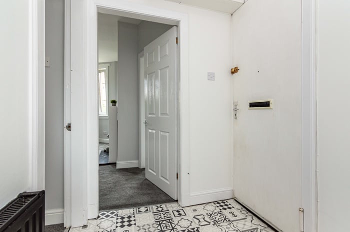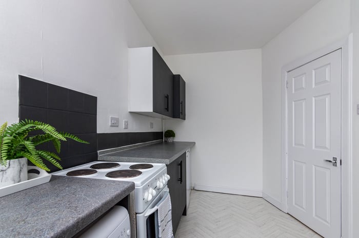 Set off the living room, the kitchen is fitted with modern units, stone effect worktops, a sink with drainer and a freestanding electric cooker, washing machine, fridge and freezer. The bedroom is set to the rear with a feature wall, carpeted flooring and generous built-in storage space; whilst completing the accommodation, the bathroom is fitted with a three-piece suite and tiled splash walls.