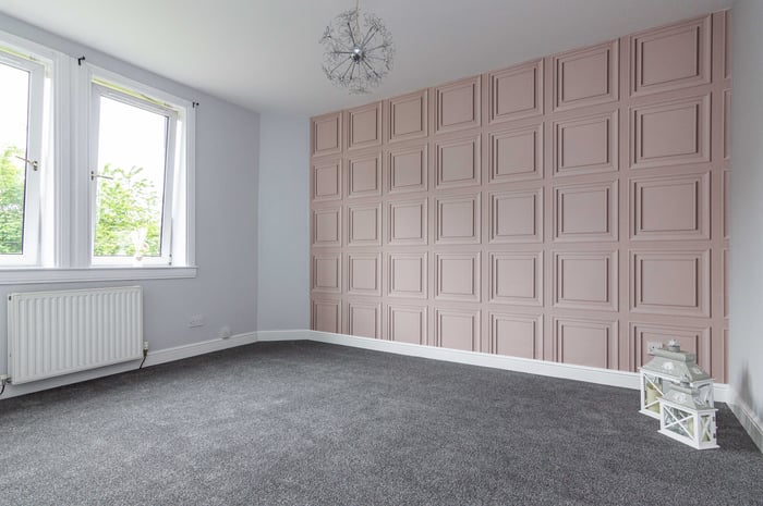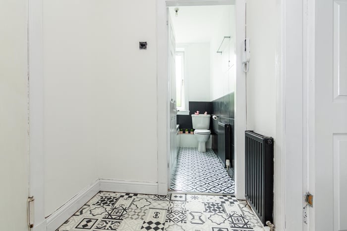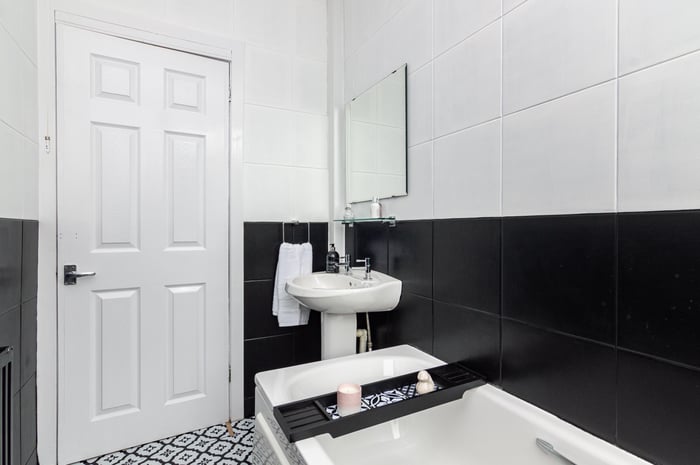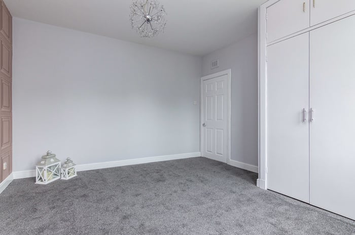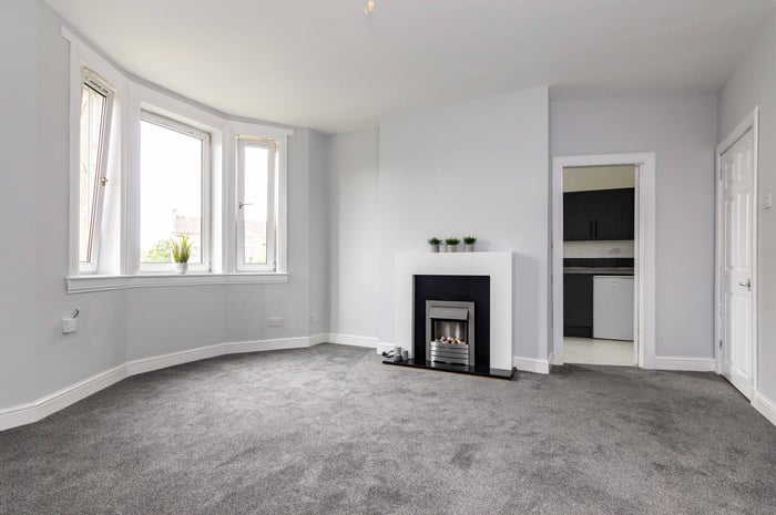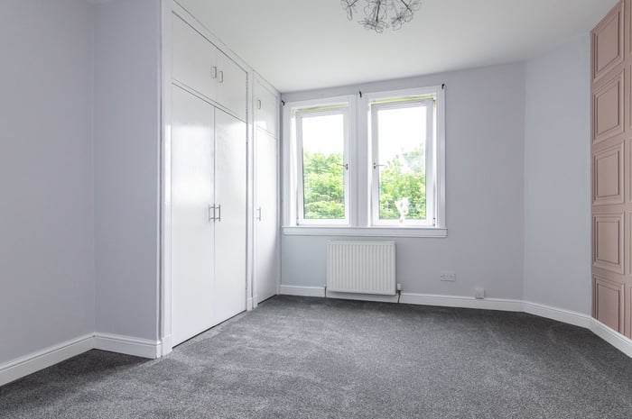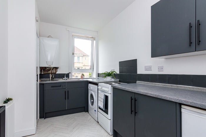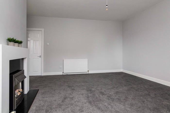 Immaculately presented, fully refurbished one bedroom, dual aspect first-floor flat, located at the end of a quiet residential cul-de-sac in the popular Lochend area, to the east of Edinburgh city centre. The entrance hall has quirky vinyl flooring and opens into the spacious front-facing living room which features a bay window, a storage cupboard, carpeted flooring and a decorative electric fireplace.
