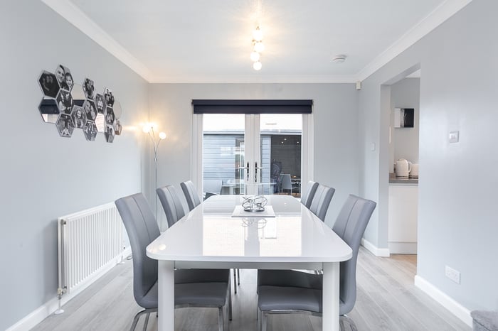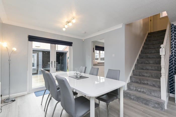 The entrance porch opens to the lounge, and gives access to the WC, whilst stylish contemporary flooring runs continuously throughout the ground floor. The spacious, dual-aspect public room easily accommodates lounge and dining furniture, and features French patio doors to the rear garden, and plain coving.