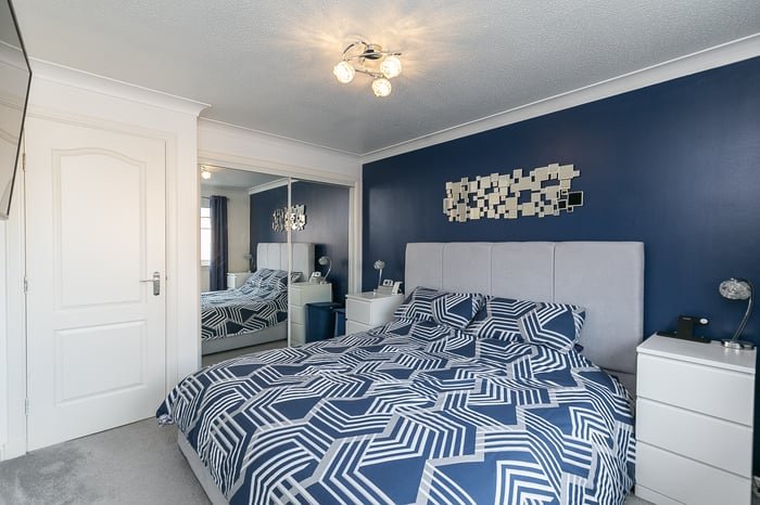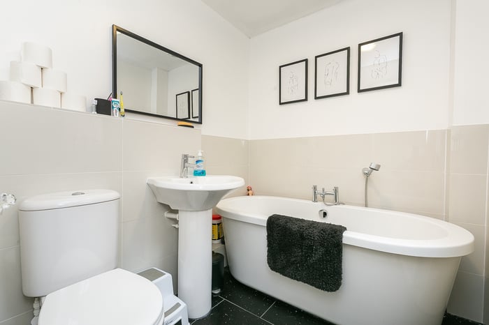 Two further well-proportioned bedrooms are set to the front, both with carpeted flooring and built-in mirrored wardrobes. Completing the accommodation, the family bathroom has a side-aspect window and is fitted with a modern suite including a freestanding bath.