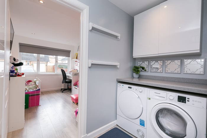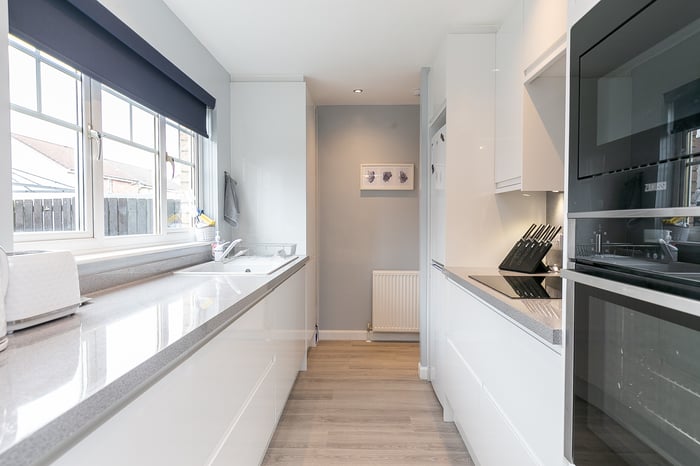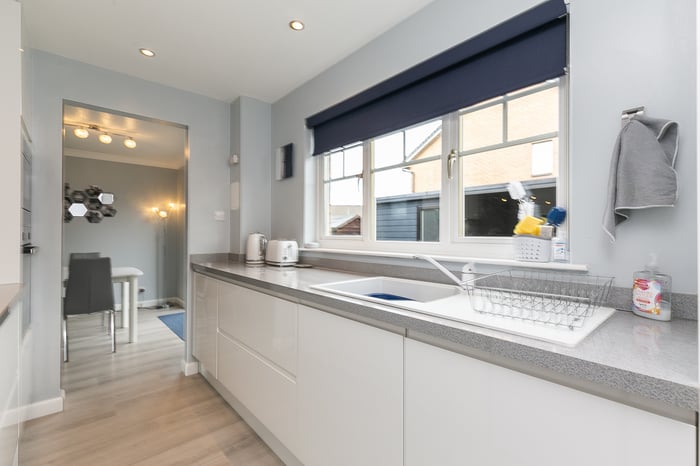 Set off the dining area, a bright and modern kitchen includes gemstone-style worktops with matching upstands, a sink with drainer; and an integrated dishwasher, oven, microwave and induction hob. Continuing from the kitchen is an inner hall giving access to an external side-aspect door, a built-in store cupboard, and to a utility area.