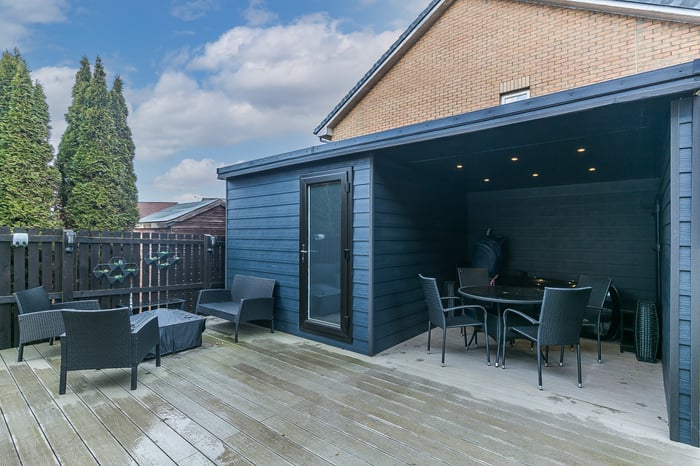 • To the front is a three-vehicle mono-blocked drive; whilst the rear garden includes a composite decked patio, and lawn, along with the garden office.