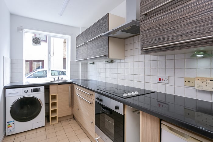 A living room enjoys plenty of natural light from generous glazing and offers a versatile floor plan for freestanding lounge furniture. Across the hall, a kitchen is fitted with wood-effect unit and granite-effect worktops, whilst appliances include an integrated oven, a ceramic hob, a stainless-steel canopy, a fridge and a washing machine.