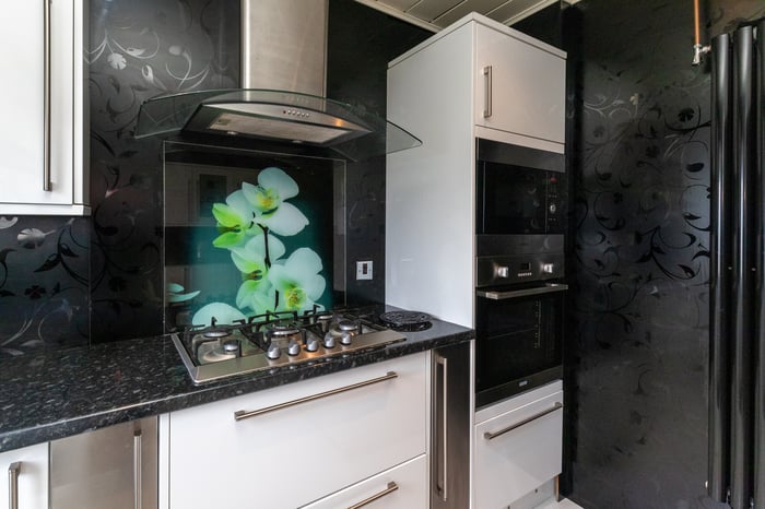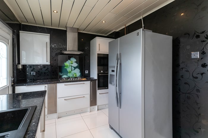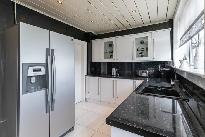 Appliances include an integrated gas hob, extractor hood, double oven, washing machine and a freestanding American-style fridge/freezer. On the mid-landing, a family size bathroom is fitted with a three-piece suite with a mains mixer shower over the bath, tiled splash walls and a ladder-style radiator.