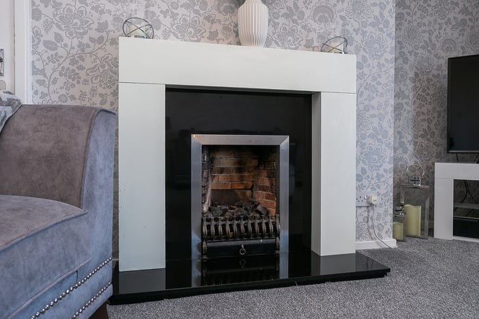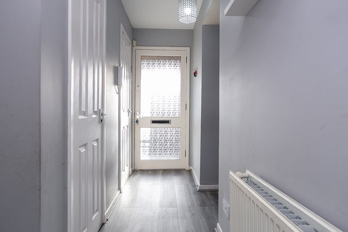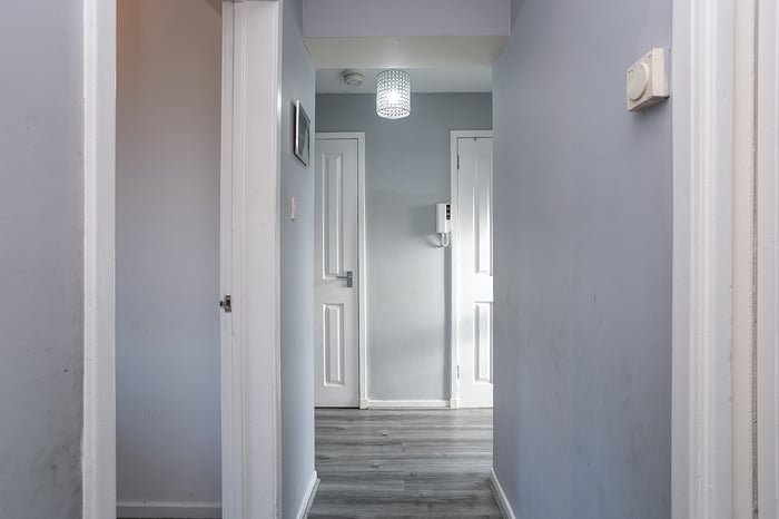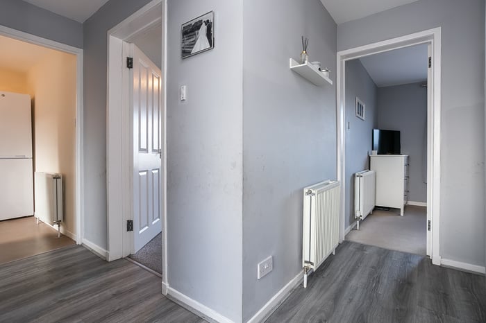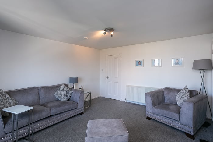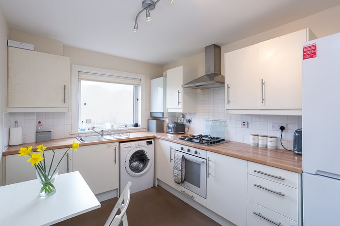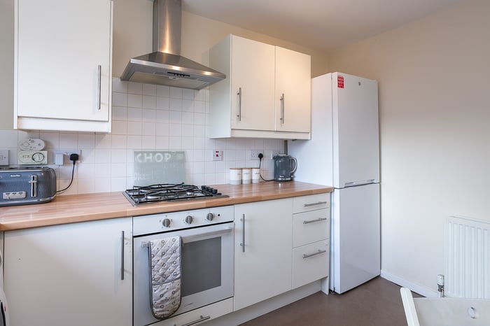 The kitchen is fitted with neutrally-toned units and splashback tiling, complemented by wood-effect worktops, whilst appliances include an integrated oven, a gas hob, a stainless-steel canopy, a freestanding fridge/freezer and a washing machine. Set to opposite aspects, two double bedrooms enjoy generous proportions and mirror the modern, neutral tones and carpeted flooring of the living space.