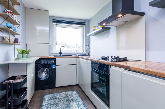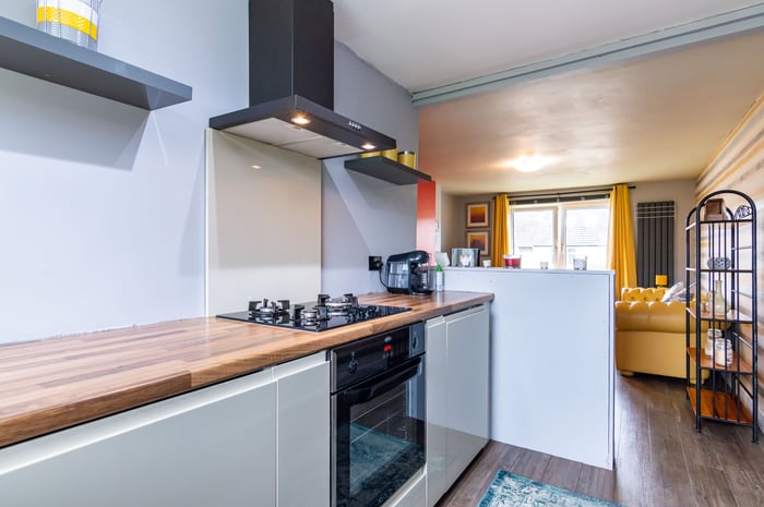 Semi-open plan to the living room, the kitchen is fitted with modern units, wood effect worktops and a composite sink. Appliances include an integrated gas hob and oven, extractor hood, fridge and freestanding washing machine.
