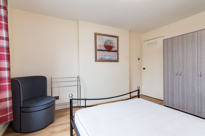 The entrance hall serves each room within the property, has the secure entry phone and two storage cupboards. Set to the front, the light and spacious living room features laminate flooring, a decorative fireplace, and space for freestanding lounge furniture.