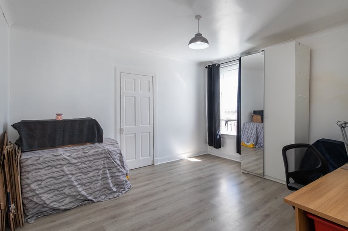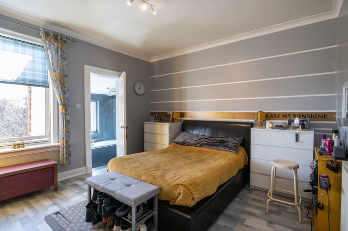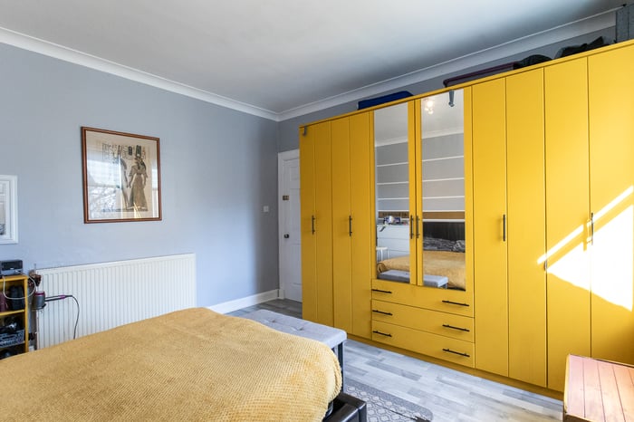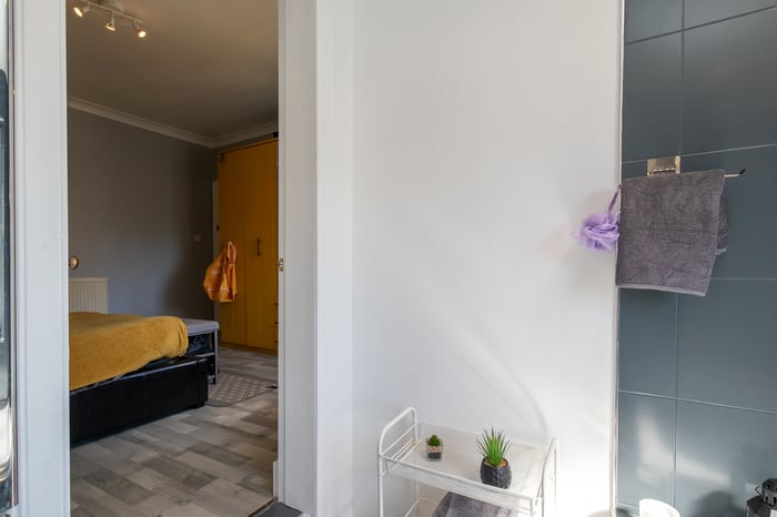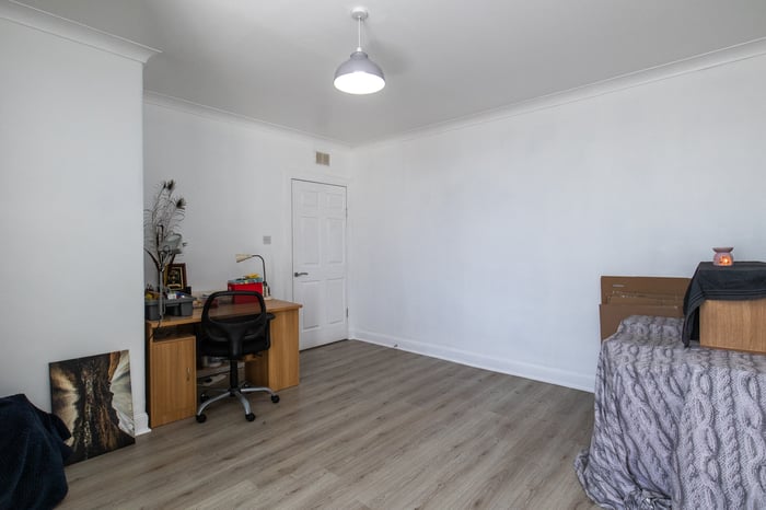 Both are fitted with modern, wood-effect flooring and, whilst bedroom one benefits from built-in wardrobe storage, bedroom two enjoys its own modern, en-suite bathroom. Set to the front, the remaining single bedroom provides a good-sized, versatile space, with storage.