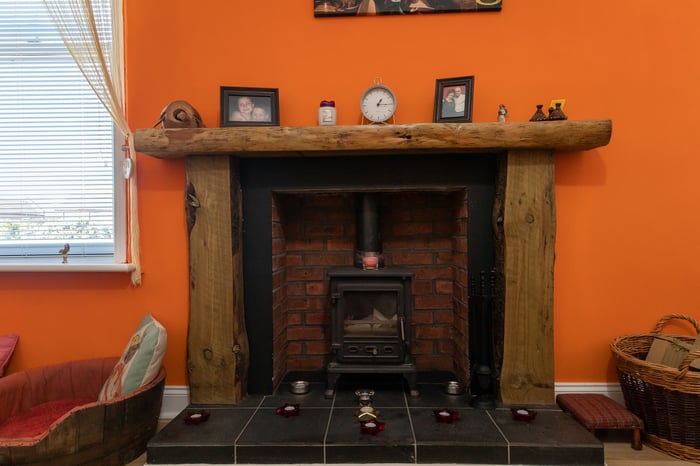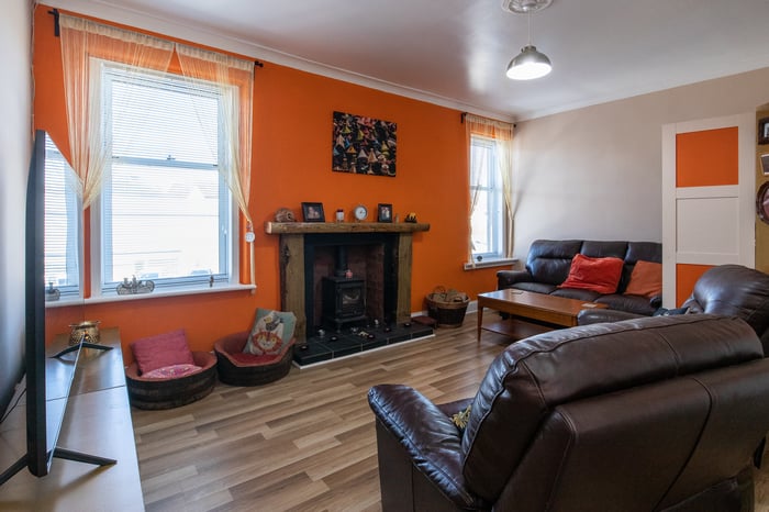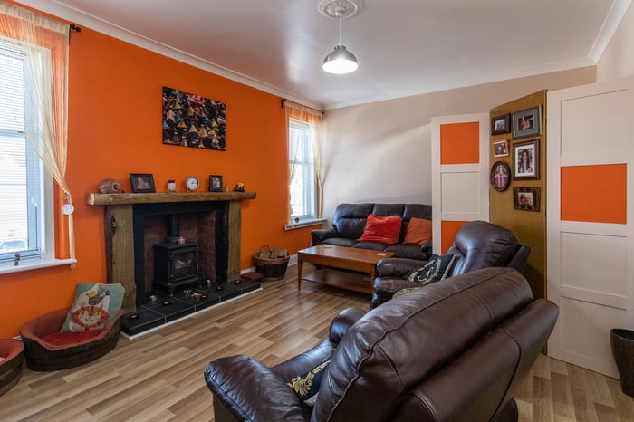 Filled with natural light from twin windows and featuring a wood-burning stove, with a timber surround, smooth cornicing and wood-effect flooring, a living room offers generous space for freestanding furniture. A characterful dining kitchen, with built-in storage, features a bay window with a window seat, and provides space for a dining table and chairs.