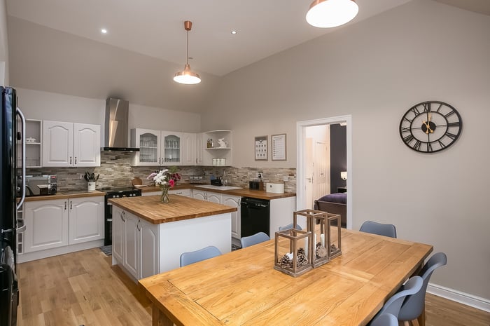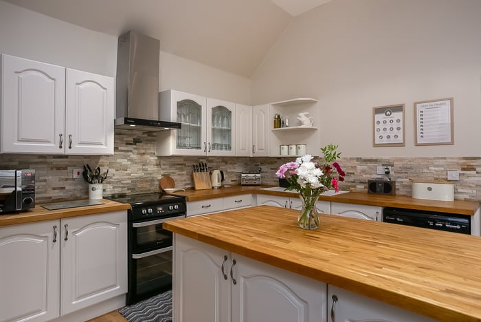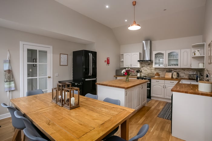 Across the hall, a well-equipped kitchen provides space for a large dining table and chairs and is fitted with a range of traditional cream units, including a central island, all complemented by solid wood worktops and rustic stone splashbacks. Appliances include a freestanding cooker with an induction hob and overhead extractor fan, an American-style fridge/freezer, a dishwasher, and a washing machine.
