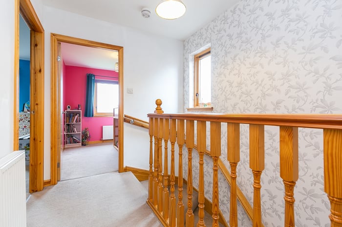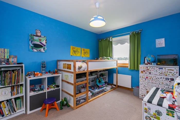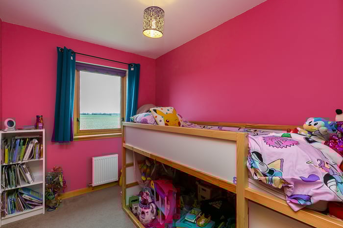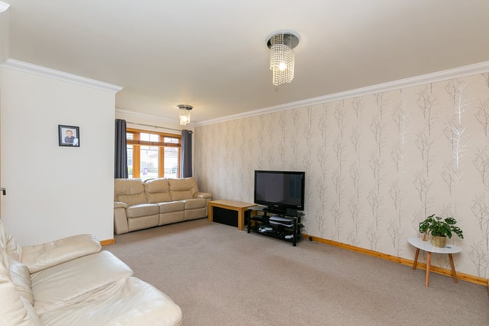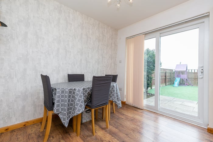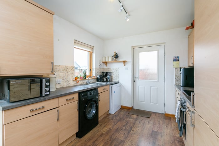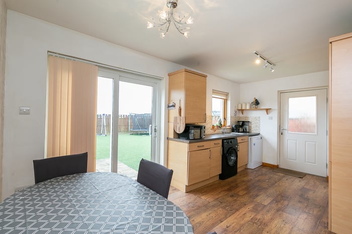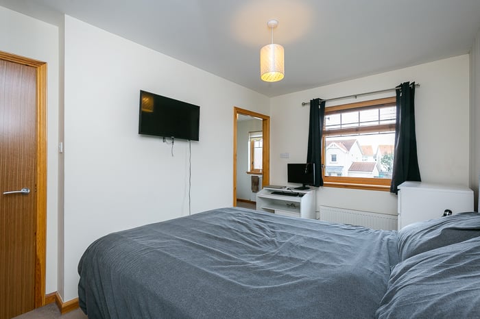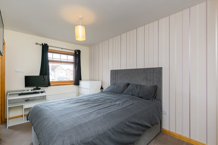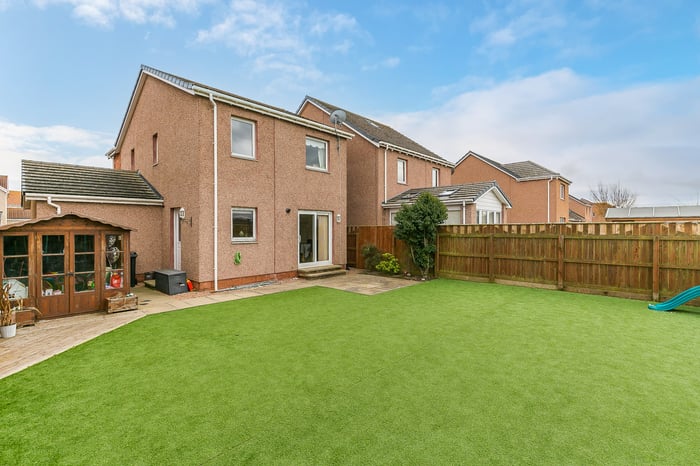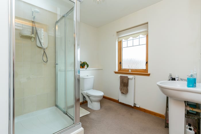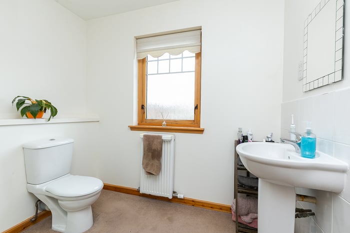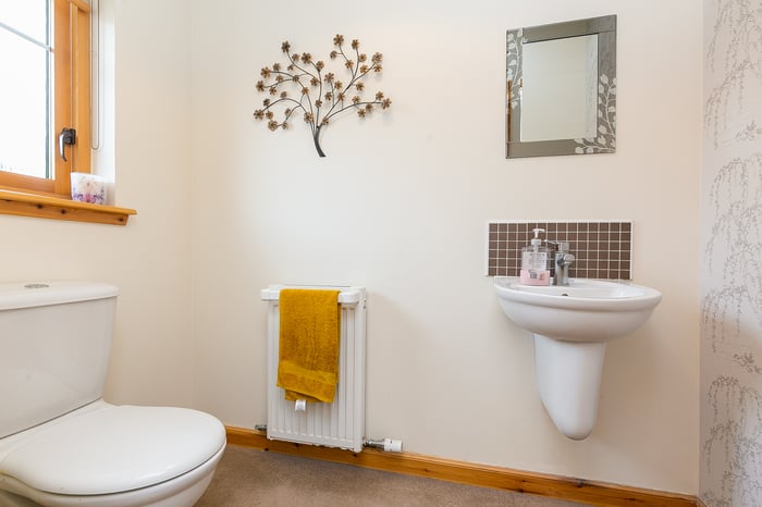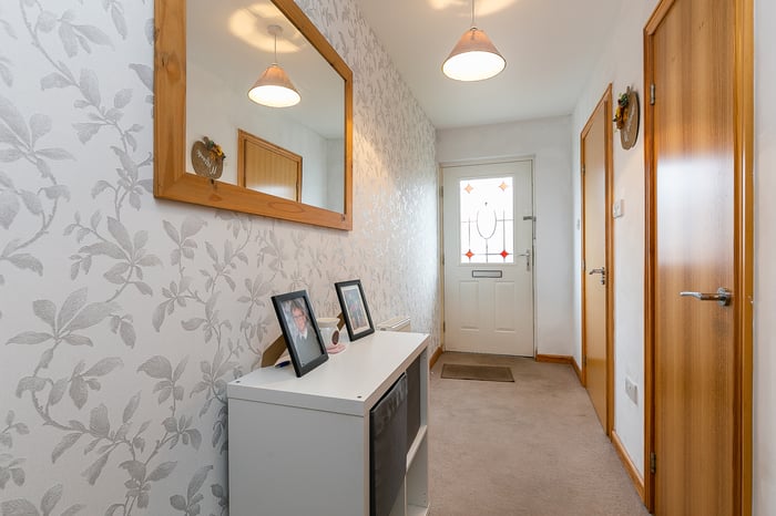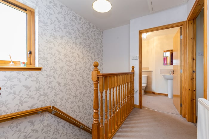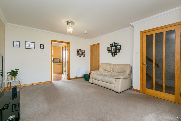 Tastefully presented, three-bedroom, detached family home with gardens, a driveway and an adjoining garage. Set in a quiet, established residential development, on the outskirts of Montrose, Angus. A welcoming entrance hall affords access to the front-facing public room, the stairs leading to the upper floor, a convenient WC and a built-in storage cupboard. The spacious living room features carpeted flooring extending from the hall, a built-in storage cupboard, two light fittings and coving.