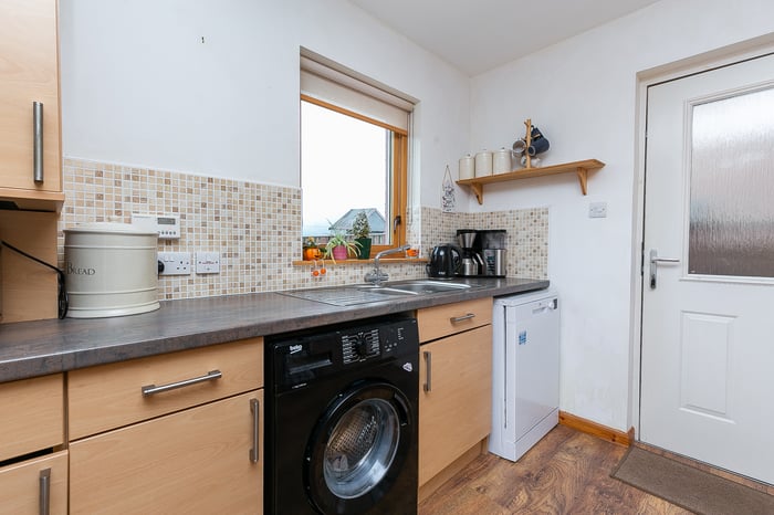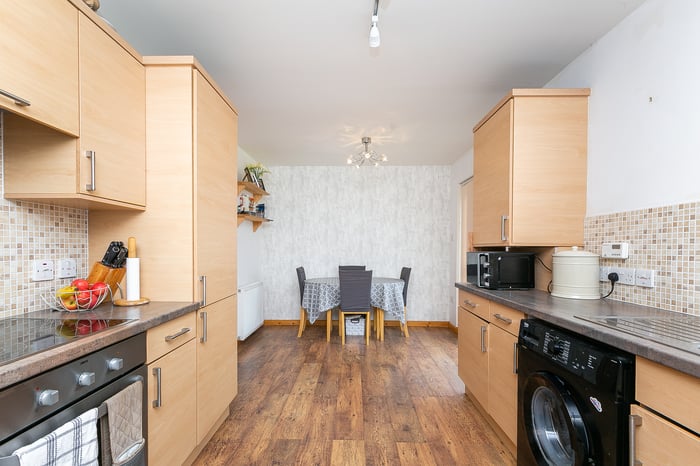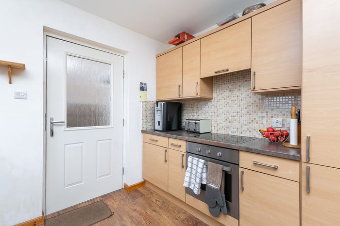 Whilst set off the living room, the kitchen is set to the rear, with garden access, ample space for dining furniture and wood effect flooring. Fitted units and worktops include a sink with drainer, a tiled surround, an integrated electric hob and oven, and a freestanding fridge/freezer.
