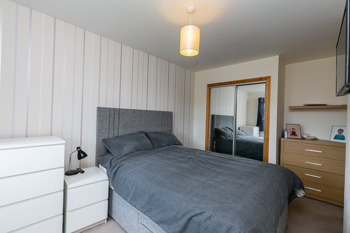 On the upper floor, the master bedroom is to the front featuring carpeted flooring, a built-in wardrobe with mirror sliding doors, a TV wall mount, and an en-suite shower room. Whilst bedrooms two and three are to the rear, similarly well-finished with bright decor, carpeted flooring, central light fittings and a built-in wardrobe with mirror sliding doors for bedroom two.
