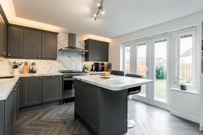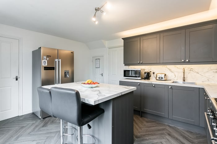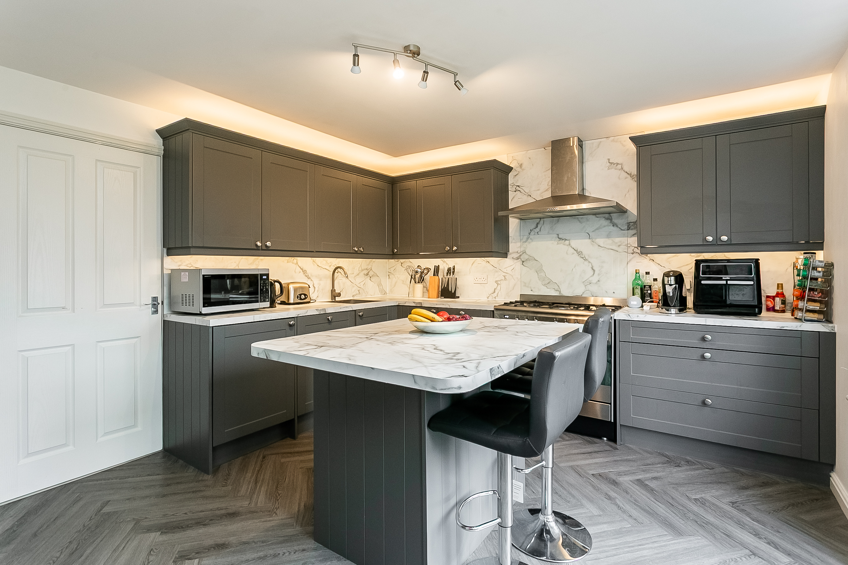 Thoughtfully designed and finished with contemporary units, marble-effect worktops and matching splashbacks, it features a sink, an integrated dishwasher and washing machine, as well as a freestanding range cooker, and an American-style fridge/freezer. A central island with a breakfast bar provides additional workspace and ample dining.