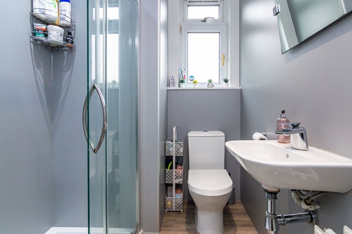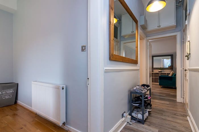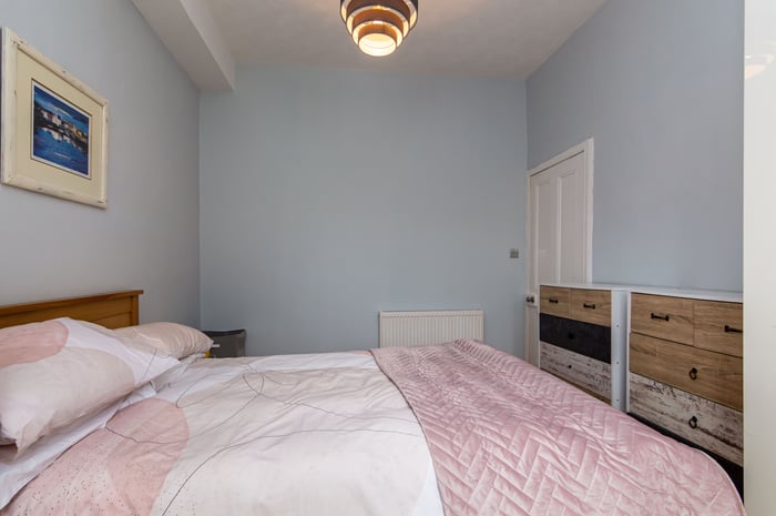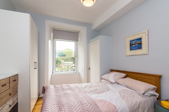 Both bedrooms quietly overlook the shared rear garden, with a built-in cupboard for double bedroom one. A modern shower room completes the accommodation and consists of a white suite, and a large shower cubicle with a mains rainfall showerhead.
