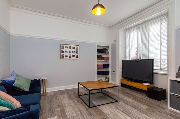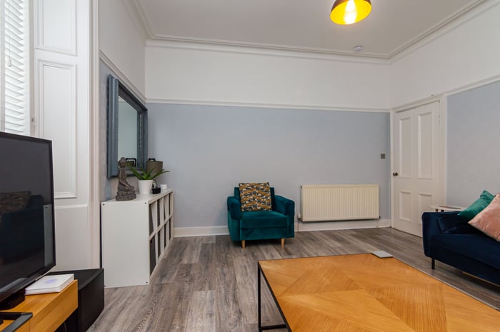 Beautifully presented, two-bedroom, dual-aspect flat, set on the ground floor of a traditional stone-built tenement, and located in the popular Blackhall area, west of Edinburgh city centre. The entrance hall grants access throughout and includes the entry phone handset and contemporary wood-effect flooring which continues through to front-set living room.