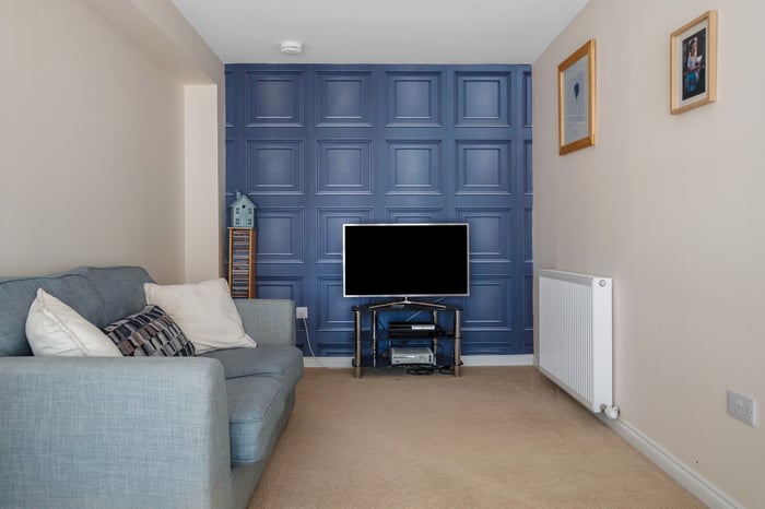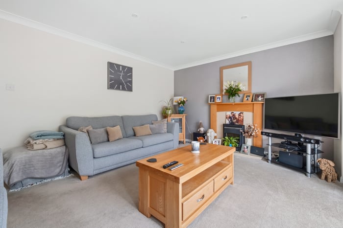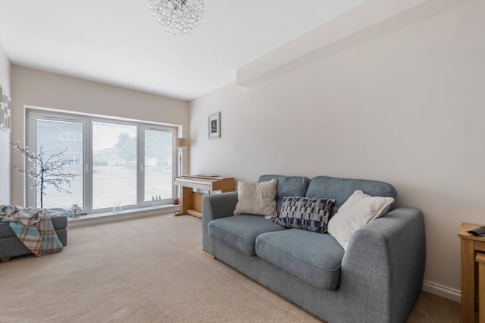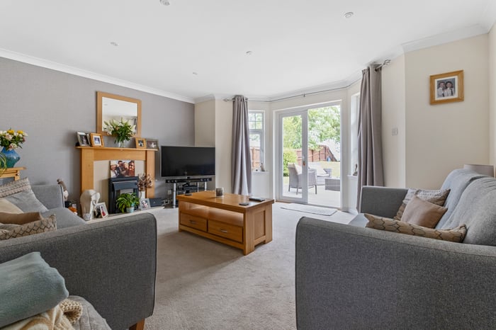The bright and spacious living room is set to the rear of the home, featuring a bay-style glazed window and patio doors opening onto the rear garden. This inviting space also includes a fireplace and carpeted flooring, creating a warm and comfortable atmosphere.