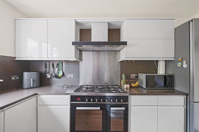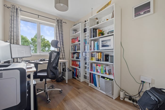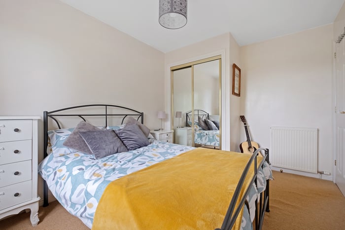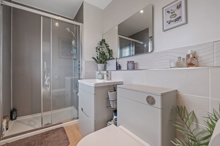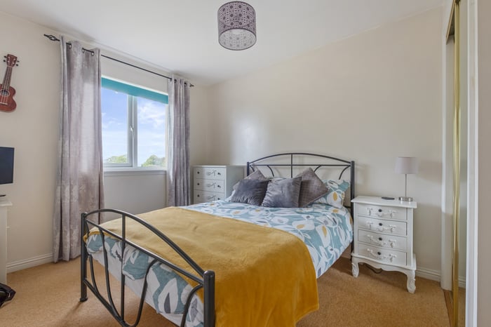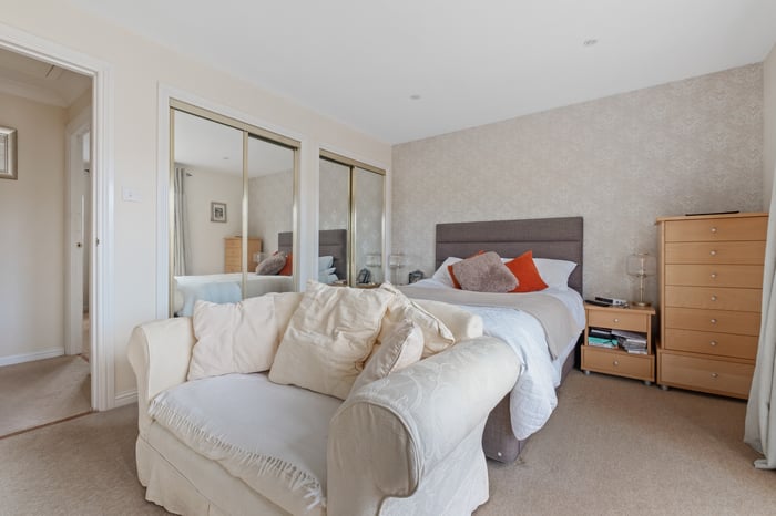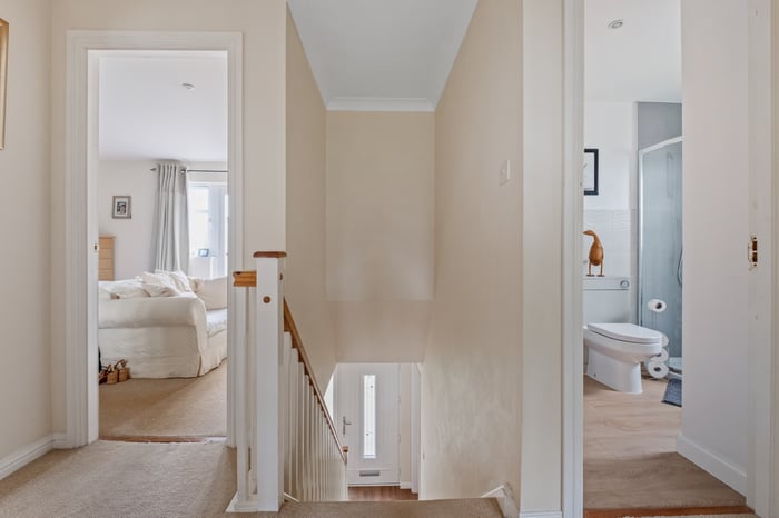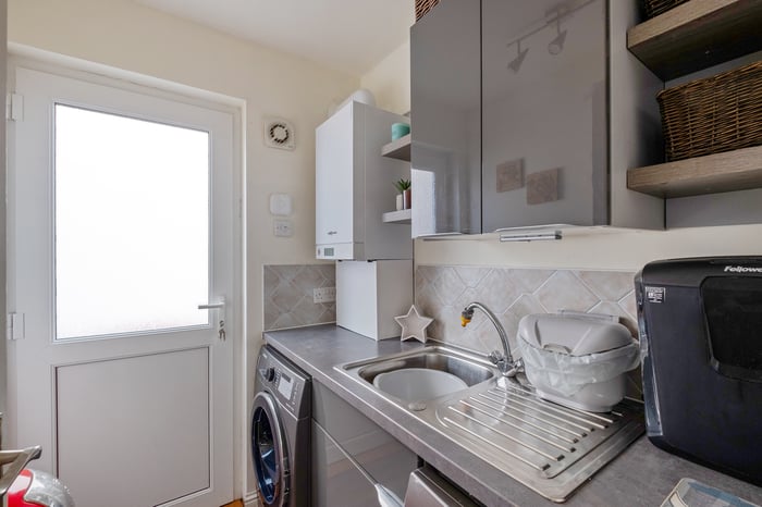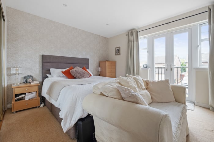 A separate utility room offers further storage, side garden access, and extra space for laundry appliances. Upstairs, the generous master bedroom and en-suite shower room extend across the width of the property, and include built-in wardrobes, an additional storage cupboard, and a charming Juliet balcony with a westerly outlook.