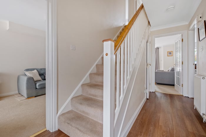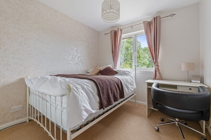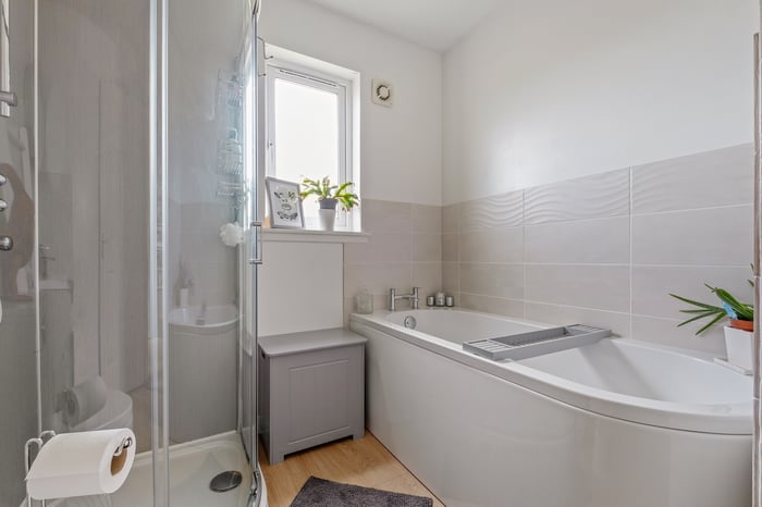 Three further bedrooms are located to the rear, overlooking the garden, two of which benefit from built-in wardrobes. A stylish four-piece family bathroom completes the accommodation, featuring a separate bathtub and shower cubicle, and modern splash wall finishes.